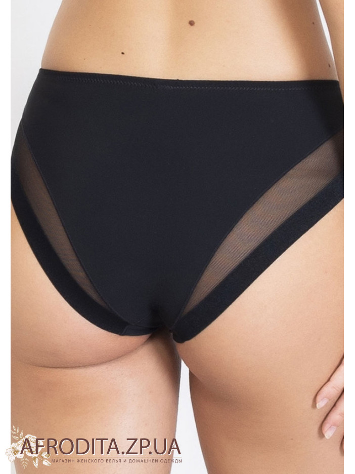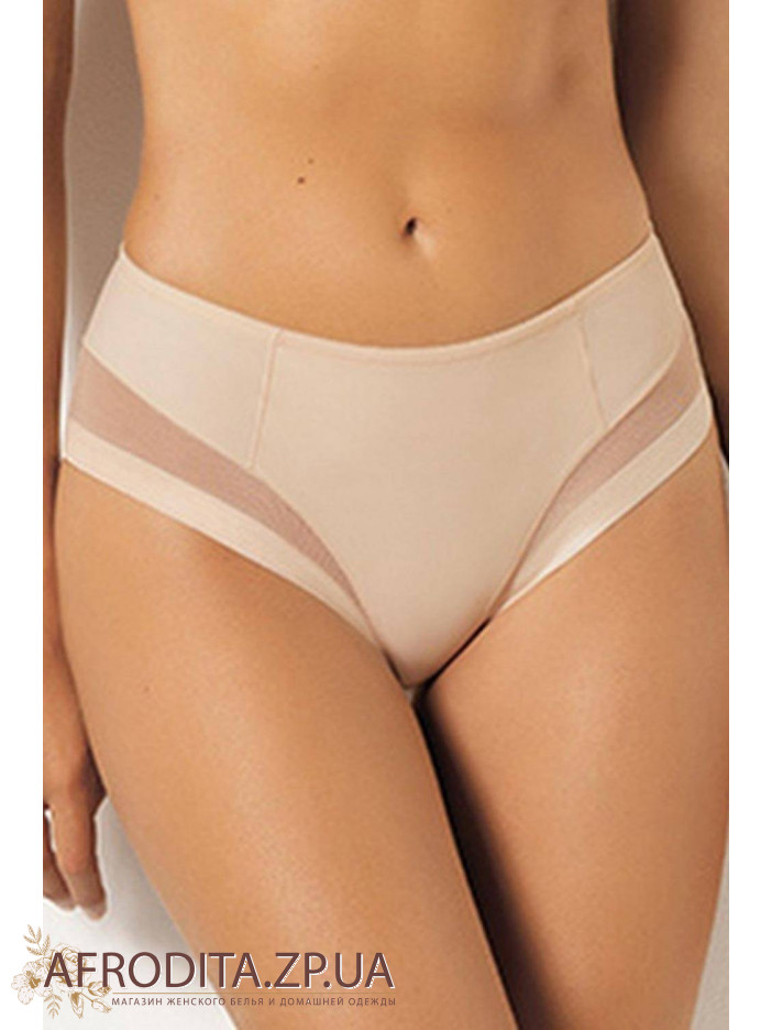 Трусики сліп з високою лінією талії, із подвійної мікрофібри. Модель з посиленою передньою деталлю по центру і здвоєного шару тканини та еластичного тюлю, завдяки цьому забезпечується ефект, що стягує, в зоні живота. Шви плоскі, обробка зрізів по стегну із тюля підходить для одягу, що облягає