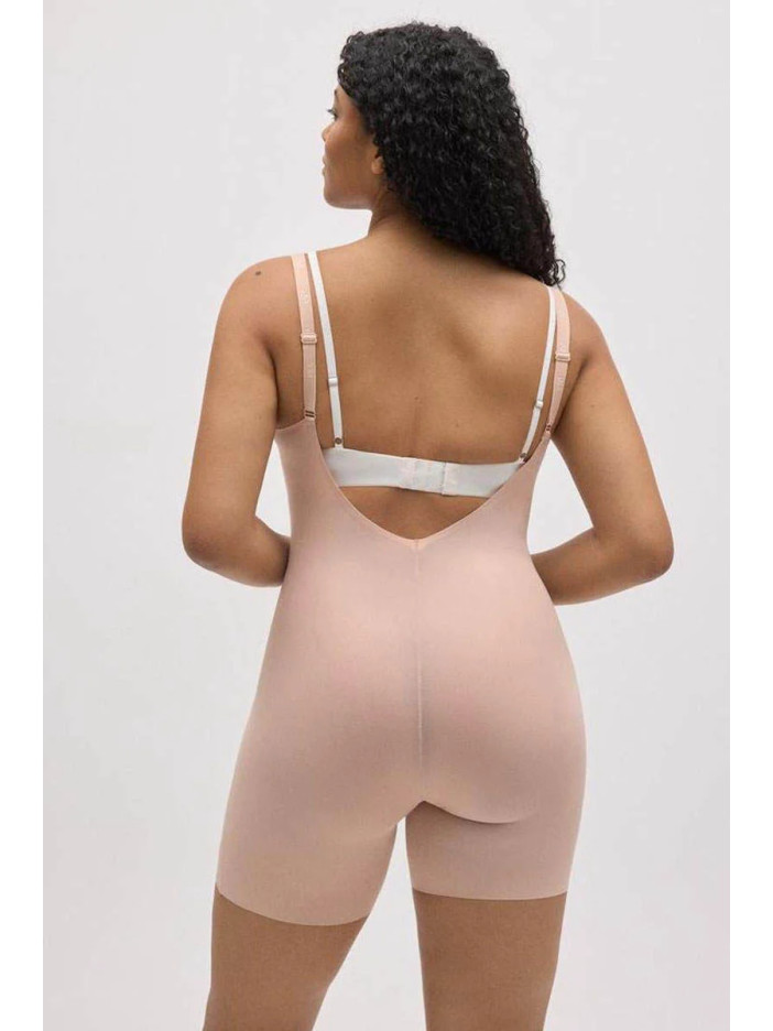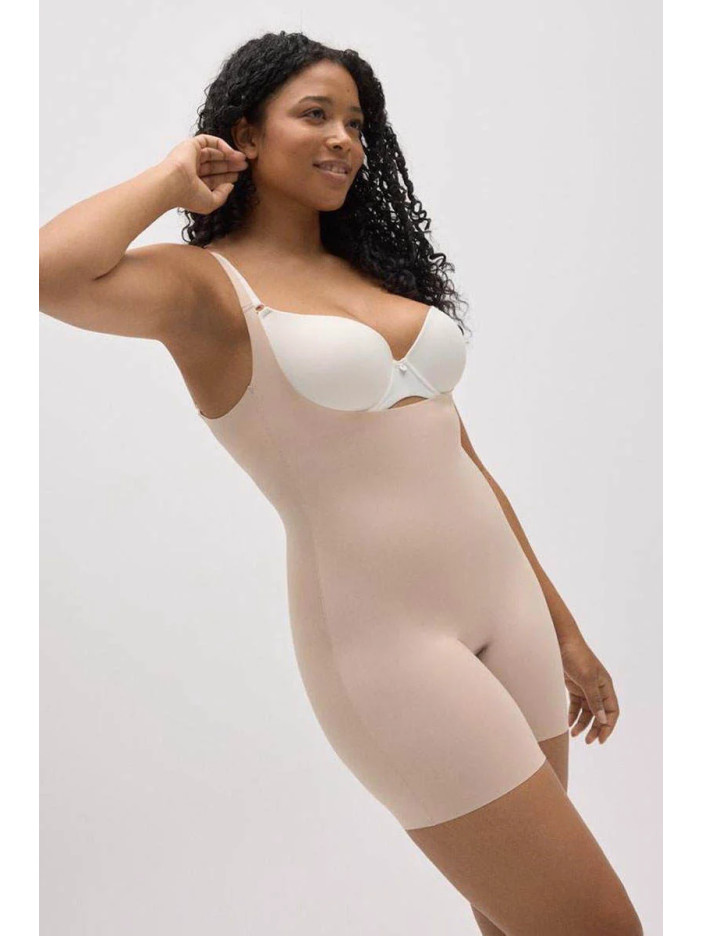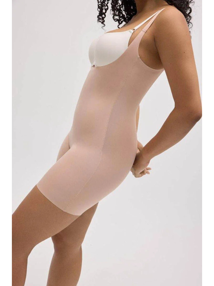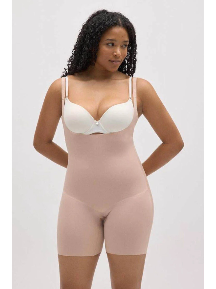 Боді, що стягує тілесного кольору від Ysabel Mora з бретелями, створює ідеально гладкий силует, м'яко моделюючи талію, живіт, стегна і сідниці без різких ліній. Відкрита зона грудей дозволяє носити боді з улюбленим бюстгальтером, що робить його ідеальним вибором для суконь з глибоким V-вирізом, вечірніх образів та напівпрозорого одягу. Середній рівень корекції підкреслює природні форми, не сковуючи рухів, а тонкий еластичний матеріал облягає тіло як друга шкіра, забезпечуючи комфорт і впевненість на весь день.