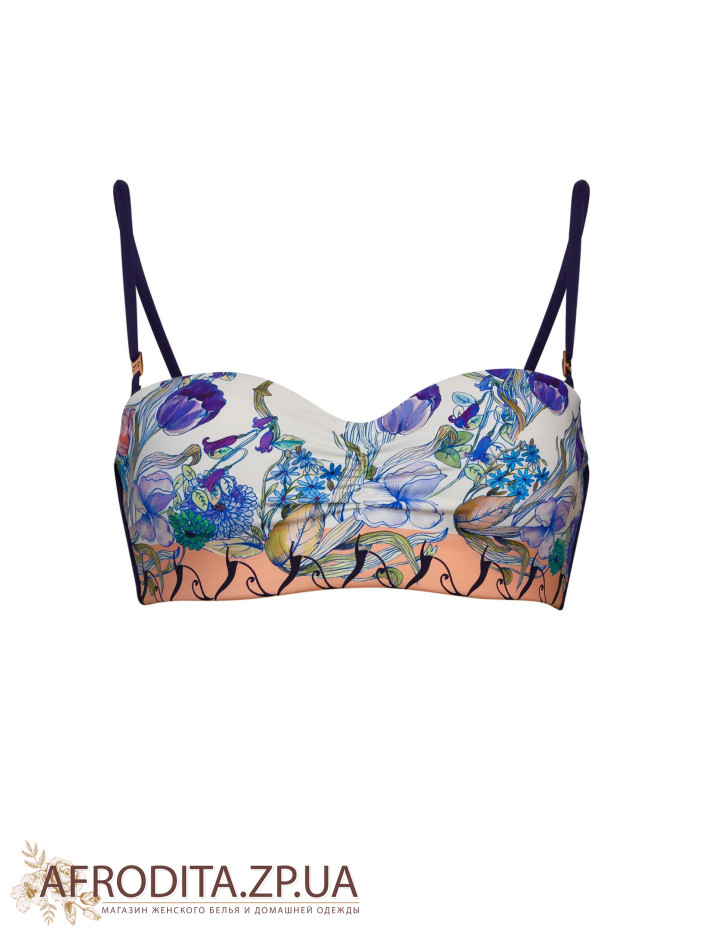 Купальник виготовлений з високоякісної мікрофібри з модним квітковим принтом. Формована чашка «бандо» на каркасній підтримки зі знімними коректорами «пуш-ап». Витончені знімні бретелі. Плавки із заниженою лінією талії, пояс з принтом.
