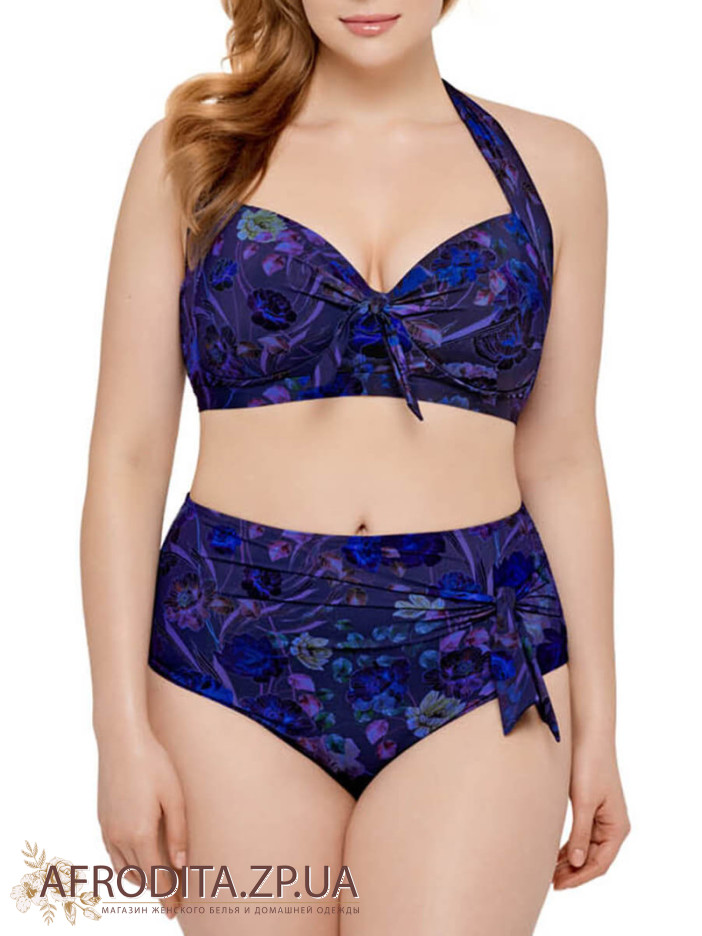 Купальник виготовлений з високоякісної мікрофібри з модним квітковим принтом. Формована чашка зі знімними коректорами «пуш-ап». Краваток бретелі навколо шиї. На спині застібка. Брифи із завищеною лінією талії. Спереду перекрут і знімний бантик.
