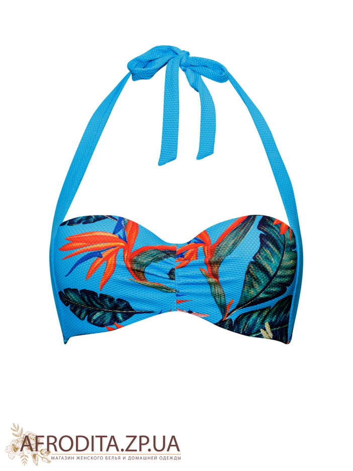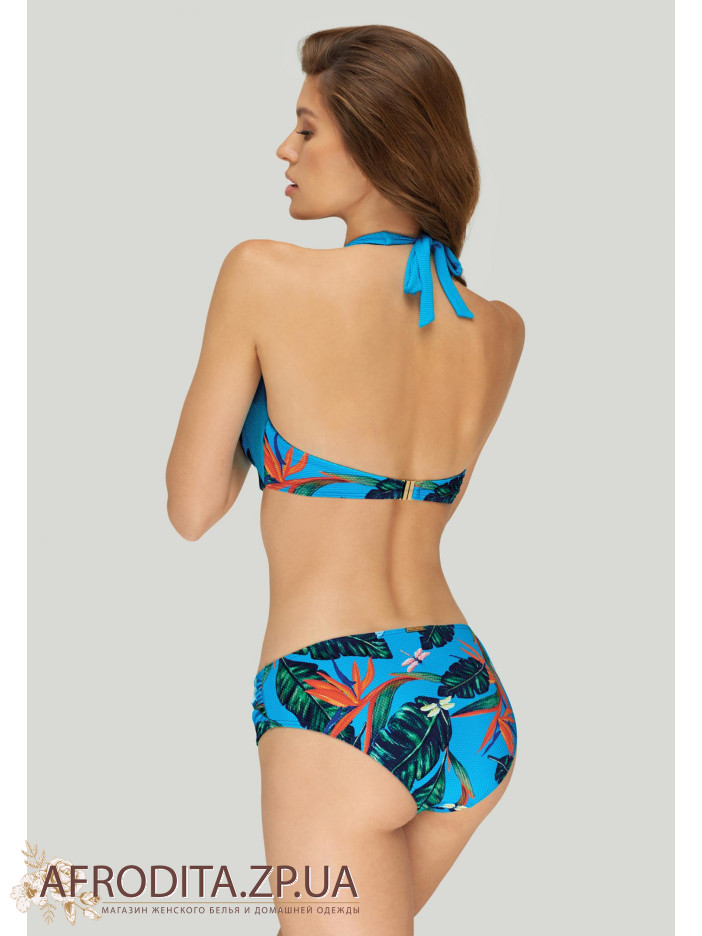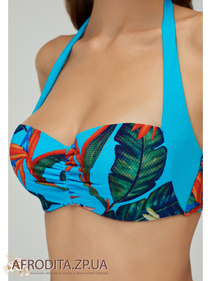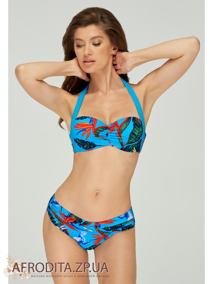 Формована чашка «бандо» на каркасній підтримці із знімними коректорами «пуш-ап».Краваткові зав'язки з боковим подкроем для додаткової підтримки грудей. На спині застібка. Плавки з заниженою лінією талії на зав'язках.