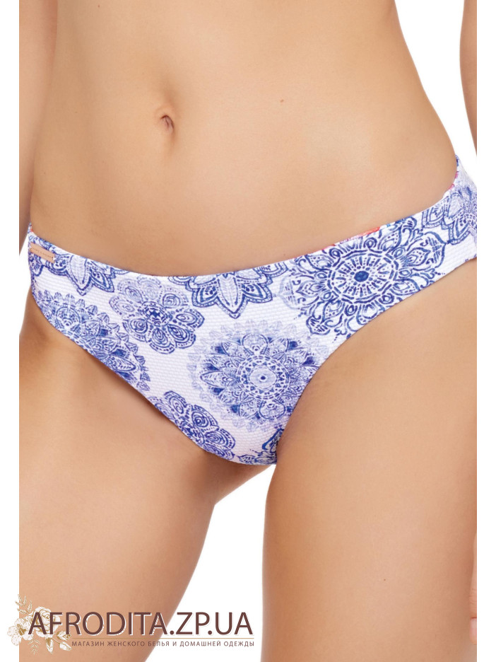 Формована чашка «бандо» на каркасній підтримці з вбудованими подушками «пуш-ап». Знімна бретель. На спині застібка. Двосторонні трусики-бріфи із середньою лінією талії.