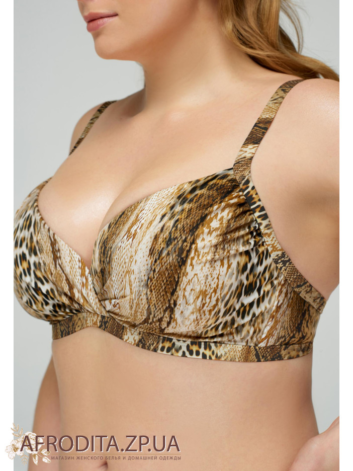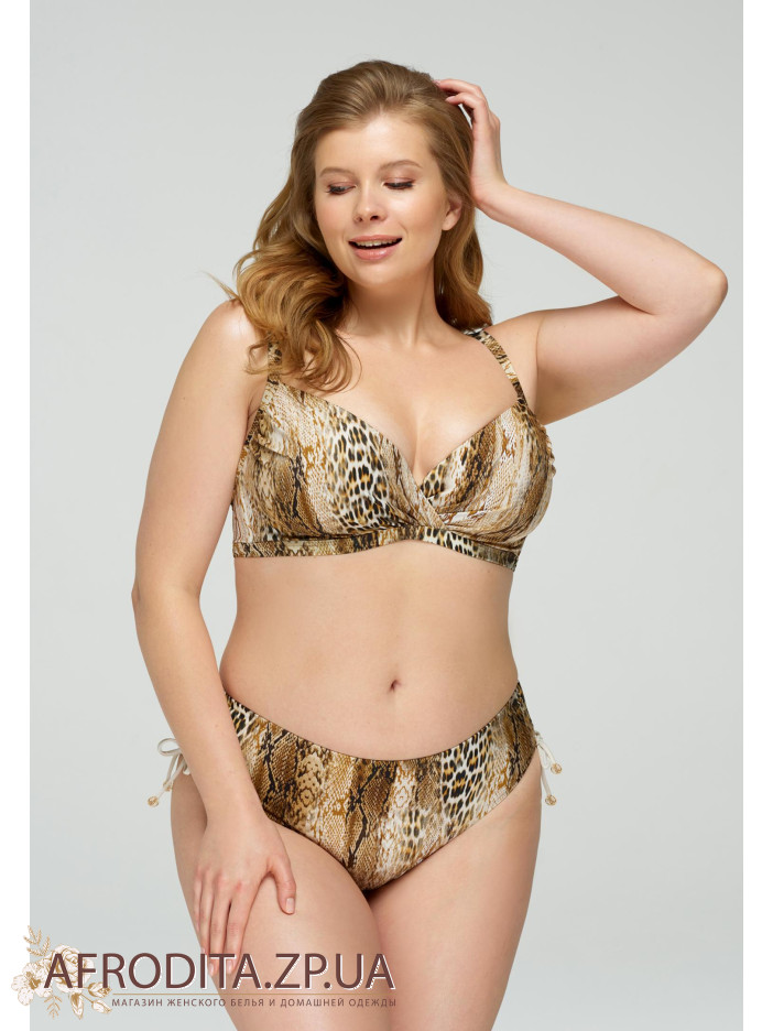 Формована чашка на каркасній підтримці, бретелі, що регулюються, що відстібаються на спинці, що дає можливість перехрестити їх ззаду, або зав'язати на шиї. На спині застібка. Анімалістичний принт "Placement" друк. Брифи з середньою лінією талії повністю прокладені другим шаром високоякісної мікрофібри. з боків куліски, що регулюють висоту плавок.
