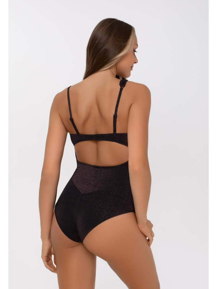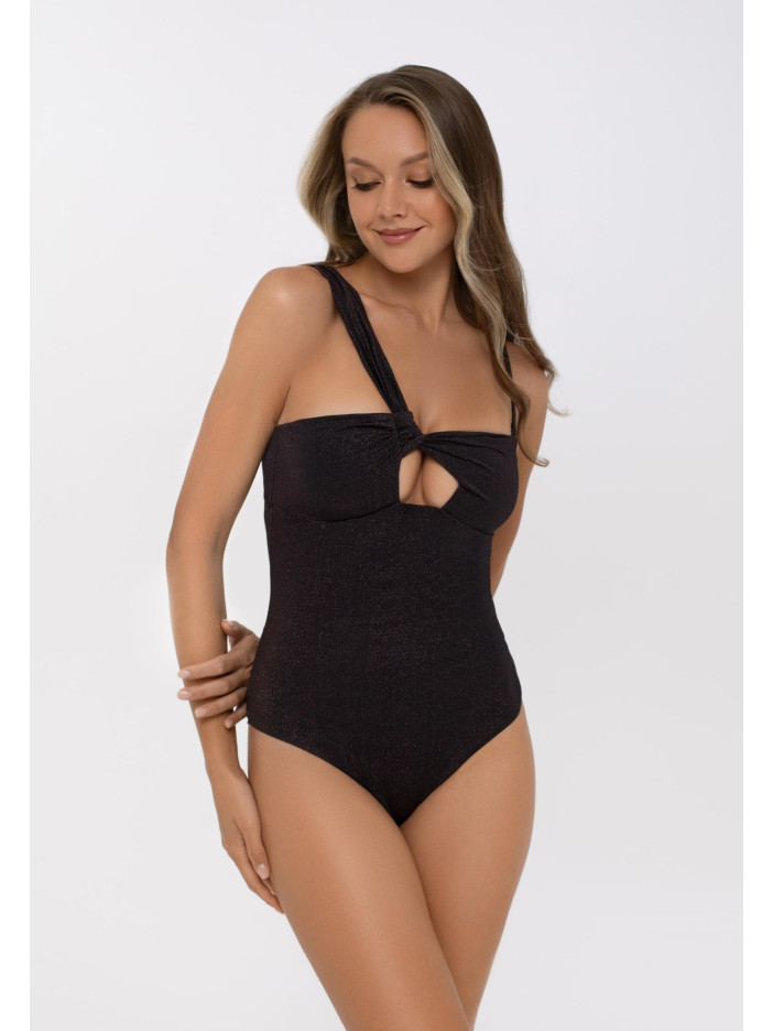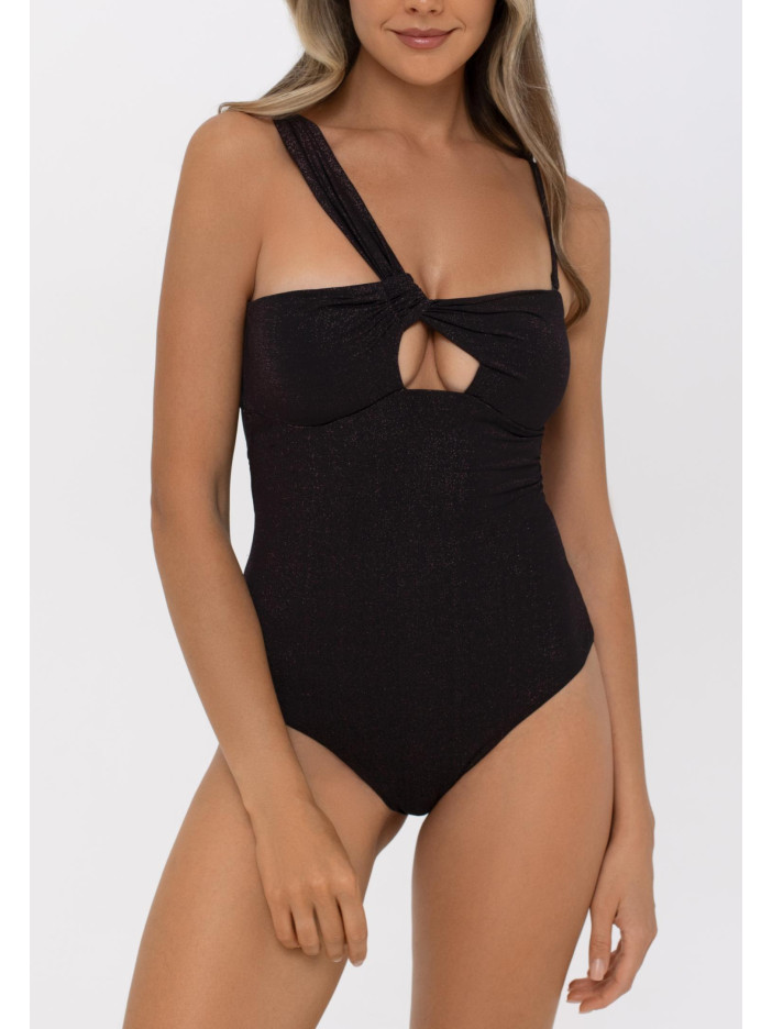 Асиметричний крій і виразна лінія декольте з вирізом між чашками підкреслюють індивідуальність, а суцільний силует із чашкою «бандо» та тонкими коректорами забезпечує комфорт і ідеальну посадку. Завищений виріз по лінії бікіні візуально подовжує ноги та додає образу ефектності.