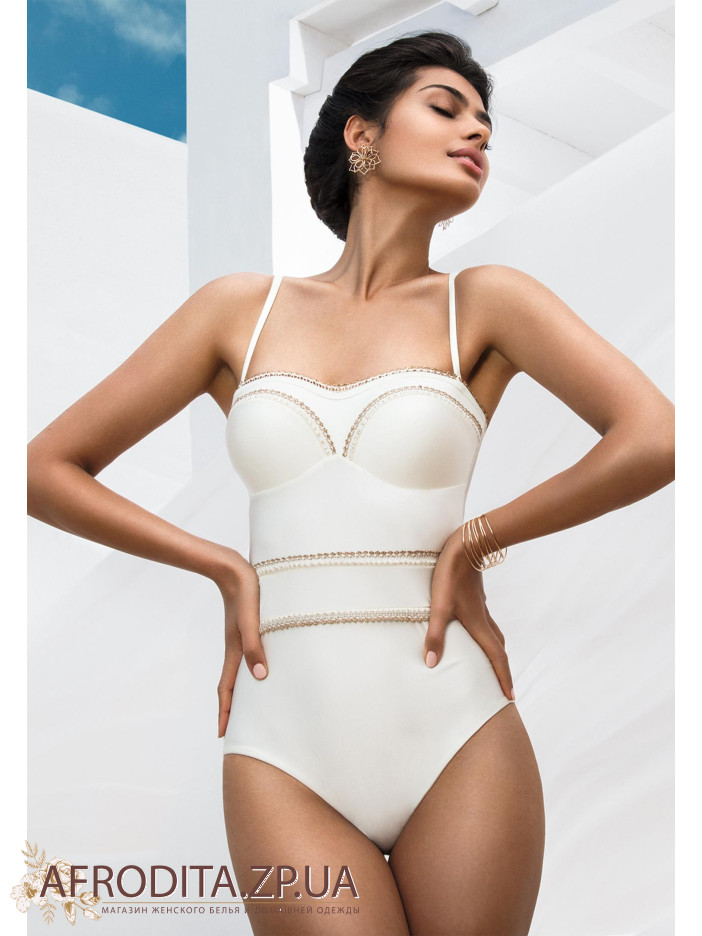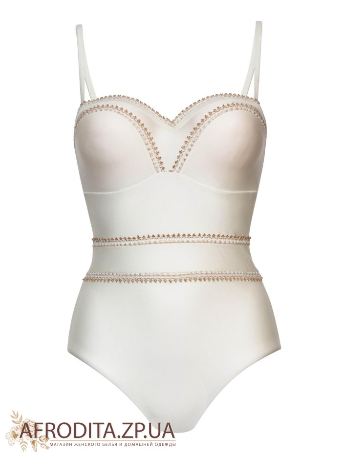 Купальник з формованою чашкою «бандо» на каркасній підтримці, з вбудованим «пуш-ап». Контрастна окантовка тасьмою з позолоченим краєм.У комплекті йдуть 2 пари зйомних бретелей - золоті і в тон основного кольору.