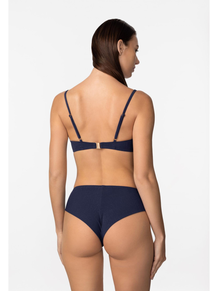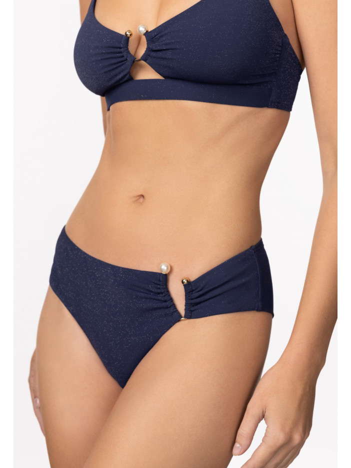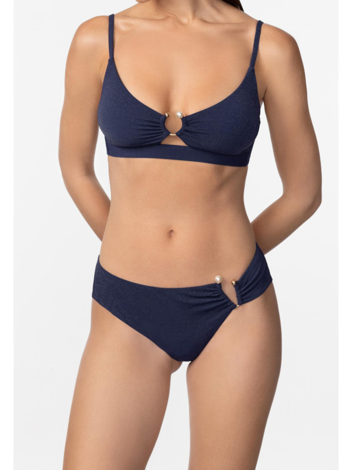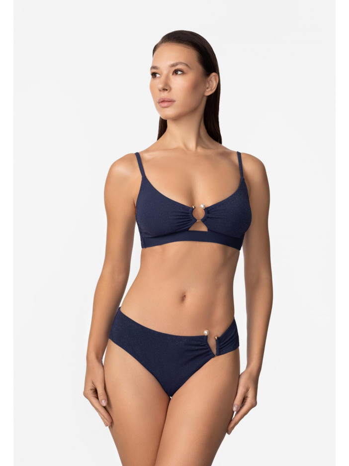 Серія MIDNIGHT RAIN натхненна загадковою красою ночі. Глибокі темно-сині відтінки, наче оксамитове небо після дощу, підкреслені м'якими драпіруванням і легким блиском сріблястої нитки, що пронизує тканину. Асиметричний крій, золоті аксесуари з перлинними акцентами та підкладка в тон створюють відчуття витонченої гармонії та бездоганного стилю. Брифи-бразиліана із середньою посадкою підкреслюють природні лінії фігури та створюють жіночний силует. Обробка задньої деталі у підворіт із чистим краєм. Асиметричне драпірування та аксесуар на передній деталі додають оригінальності та елегантності образу.