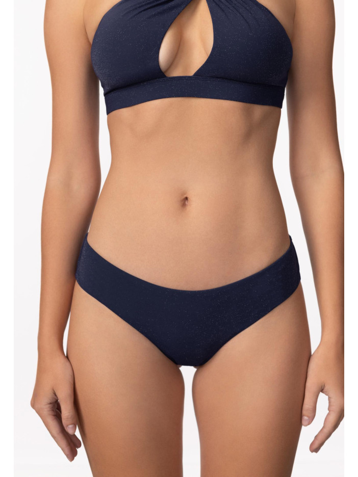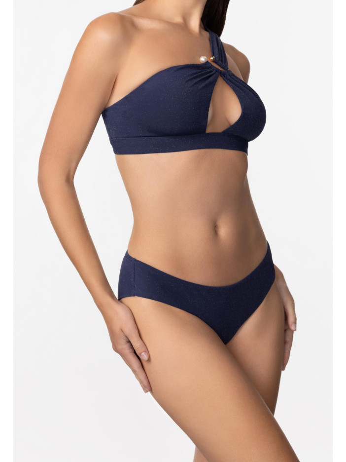 Серія MIDNIGHT RAIN натхненна загадковою красою ночі. Глибокі темно-сині відтінки, немов оксамитове небо після дощу, підкреслені м'якими драпіровками і легким блиском сріблястої нитки, що пронизує тканину. Асиметричний крій, золоті аксесуари з перлинними акцентами і підкладка в тон створюють відчуття витонченої гармонії і бездоганного стилю. Бріфи-бразиліана із середньою посадкою підкреслюють природні лінії фігури і створюють жіночний силует. Обробка задньої деталі в підворот з чистим краєм.