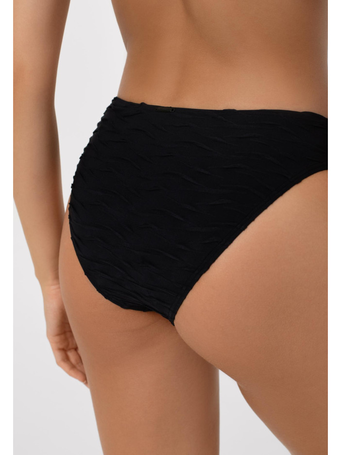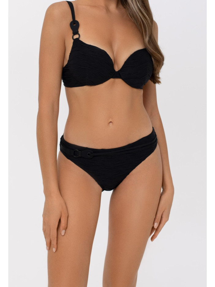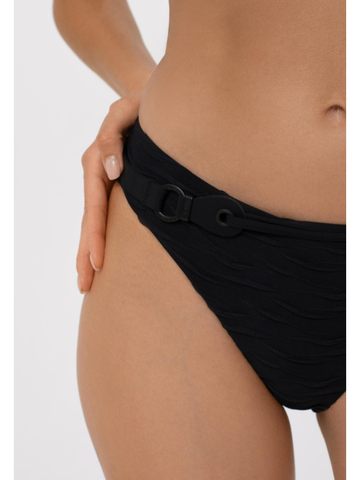 Вічна класика поєднується з сучасним стилем у купальнику із серії FRENCH CODE «чорне на чорному»! Однотонна тканина з багатою текстурою прикрашена рельєфними хвилястими жакардовими смужками, створюючи спокусливий та витончений ефект, смарагдово-зелена підкладка з сатиновим блиском і чорні матові аксесуари додають оригінальний акцент і роблять морську тематику багатогранною. Жіночі плавки із середньою лінією талії створюють гармонійний силует, на передній деталі декоративний пояс з аксесуаром додає стиль і елегантність, забезпечуючи впевненість та комфорт у кожному русі.