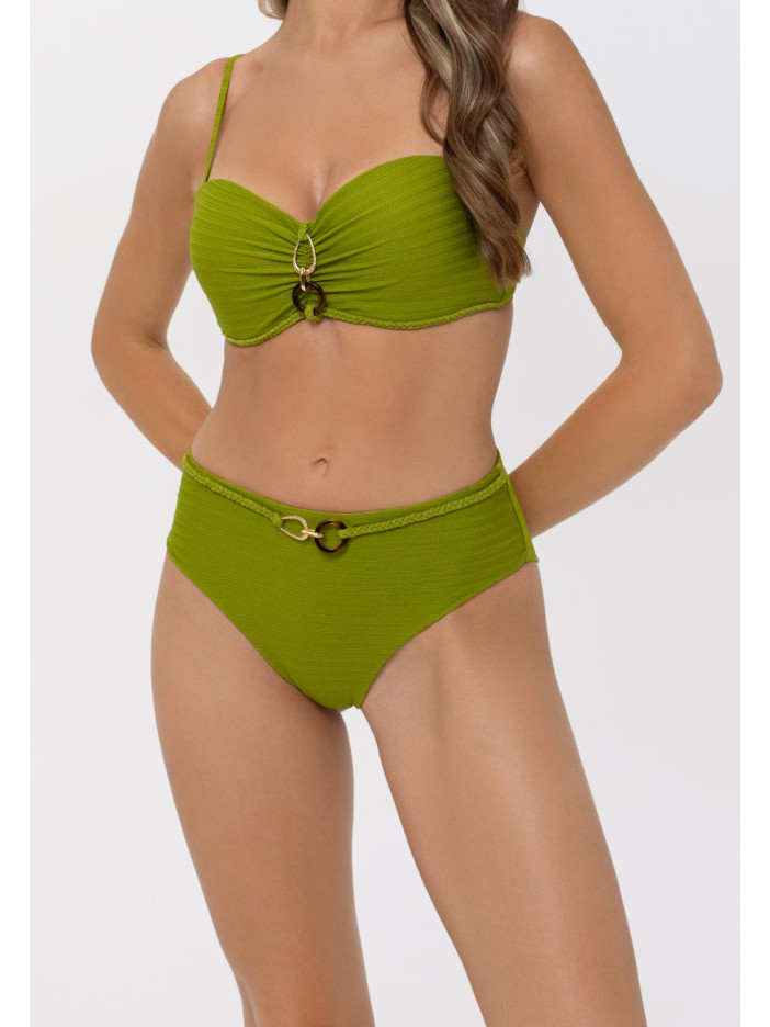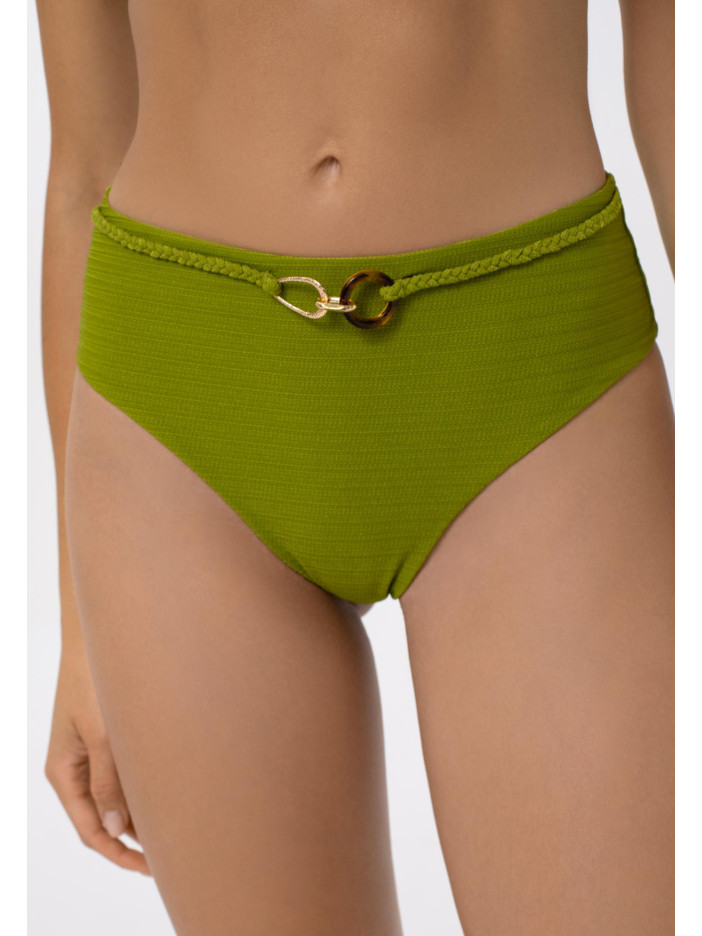 Плавки жіночі-бразиліана із середньою лінією талії. На передній деталі декоративний пояс-косичка з аксесуаром. Вертикальний шов на задній деталі. Обробка задньої деталі в підворіт із чистим краєм.