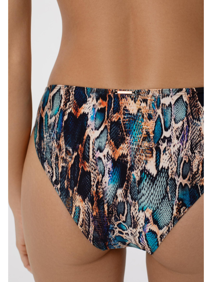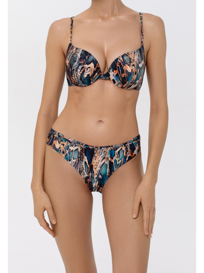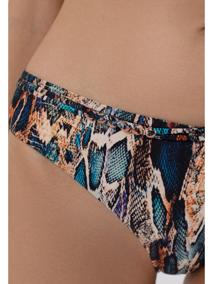 Бірюза та золото — розкішне та спокусливе поєднання для літньої серії SENSUAL SKIN. Анімалістичний принт із ефектом шкіри змії у переливаючихся бірюзових, блакитних та золотистих відтінках нагадує безтурботну красу лагун і золотих пляжів. Гладка тканина з сяйвом та витончені деталі у вигляді тонких кіски і ланцюжків кольору рожевого золота створюють заворожуючий 3D-ефект. Плавки із середньою лінією талії зручно сидять і підкреслюють фігуру, а тонкий декоративний пояс із аксесуаром на передній деталі додає елегантності та стильного акценту. SENSUAL SKIN — стиль, комфорт і літній настрій у кожній деталі.