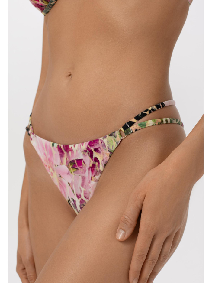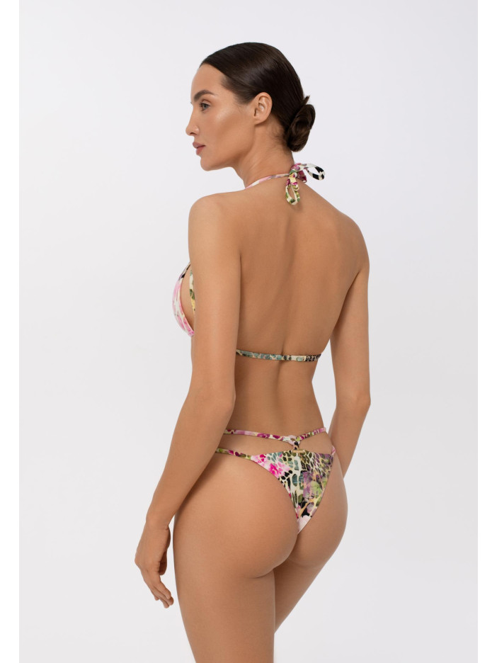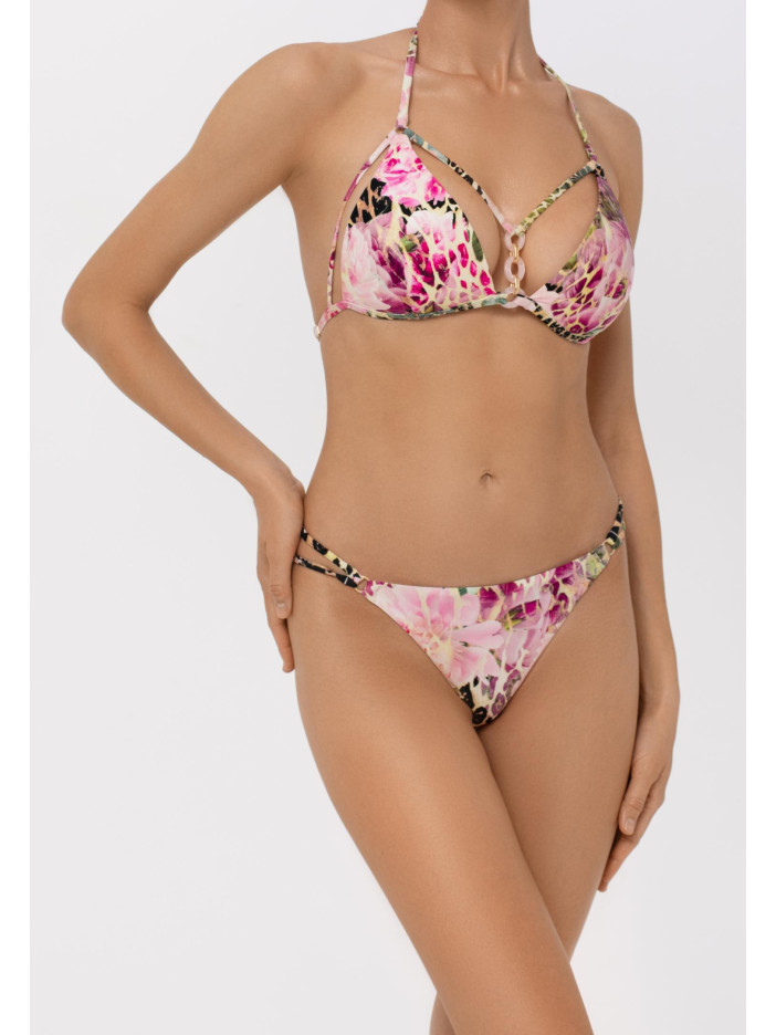 У серії FUSION ексклюзивний принт поєднує тропічні квіти з леопардовим мотивом у багатошаровій композиції, створюючи стильний та унікальний образ. Рожеві, блакитні, жовті та зелені переливчасті відтінки, доповнені ніжними перламутровими деталями, дарують відчуття літнього відпочинку та легкості. Ультрагладка поверхня тканини та високоякісний друк підкреслюють витонченість кожної деталі. Плавки міні-бразиліана з заниженою талією, пояс з декоративною тасьмою та аксесуаром підкреслюють фігуру, а задня деталь із чистим підворотом додає елегантності та завершеності образу. FUSION — стиль, комфорт і літній настрій у кожній деталі.