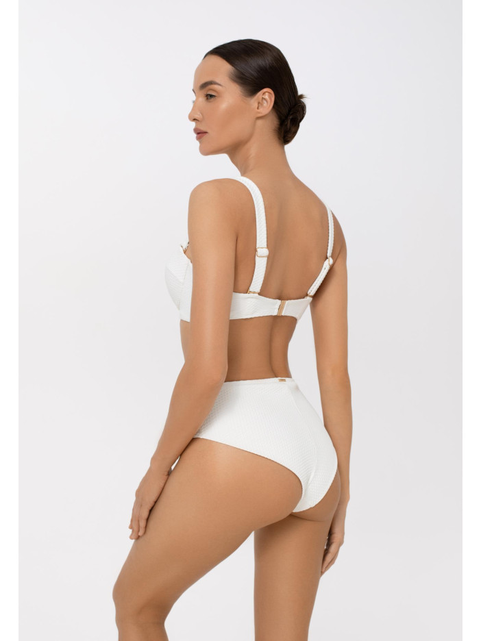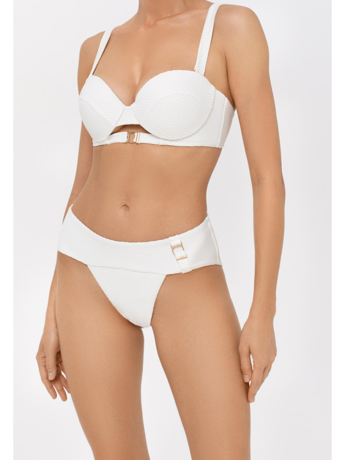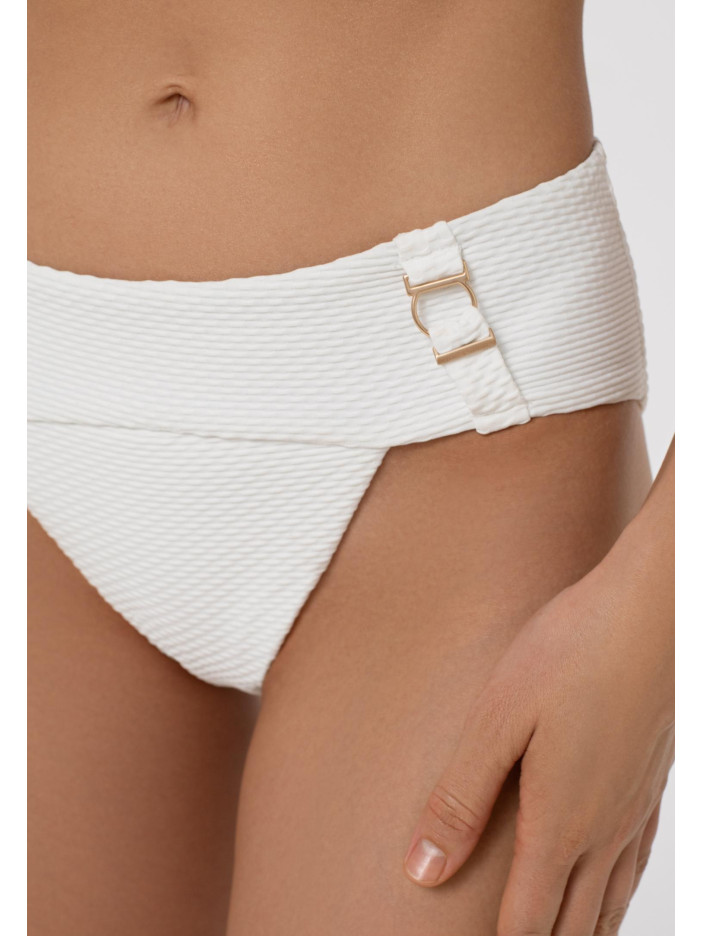 Жіночі плавки PURE AFFECTION у лаконічному білому кольорі — це поєднання ніжності, розкоші та сучасного дизайну. Фактурний матеріал і золотий аксесуар створюють витончений образ у стилі Французької Рив’єри, де кожна деталь говорить про елегантність. Модель бразиліана із середньою лінією талії підкреслює фігуру, а декоративний широкий пояс спереду додає акценту та шику. Вертикальний шов на задній деталі красиво формує силует, а обробка в підворіт із чистим краєм забезпечує комфорт і бездоганну посадку. Ідеальний вибір, щоб відчути себе справжньою красунею з обкладинки.