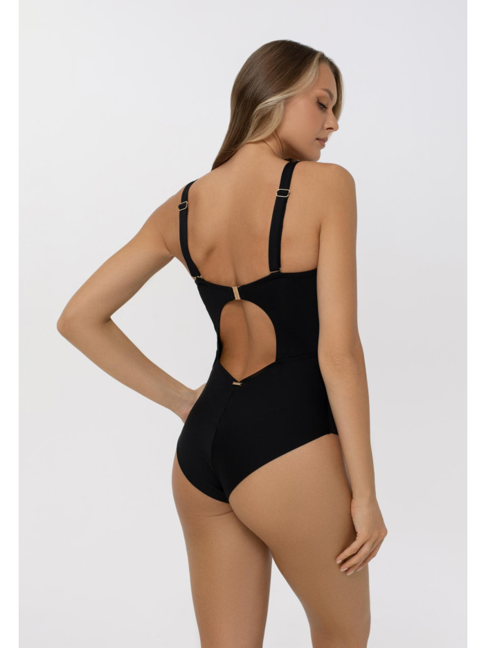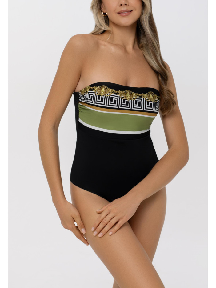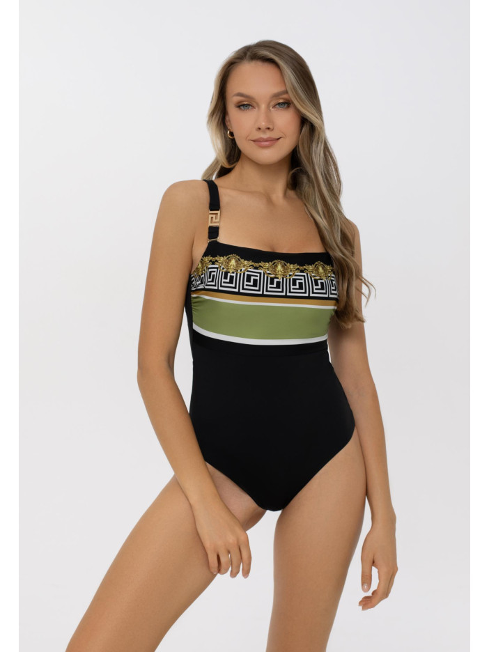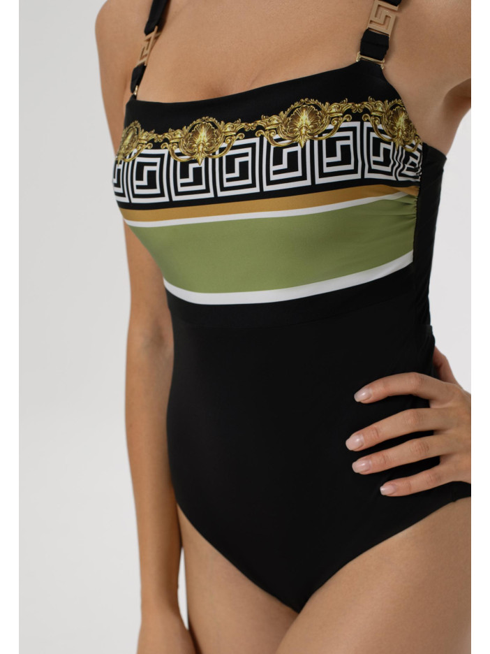 Геометричний орнамент у золотих тонах, натхненний епохою Бароко, створює витончені узори серії BAROQUE TWIST. Гірчично-жовті та зелено-жовті смуги на контрастному чорному фоні підкреслюють розкіш тканини Jersey Lomellina від європейського виробника. Суцільний купальник із м’якими чашками на кісточках, тонкими знімними коректорами та підтримуючою резинкою під грудьми. Знімні регульовані бретелі з декоративним аксесуаром, відкрита спина із застібкою, спереду — ефектний «Placement» принт.