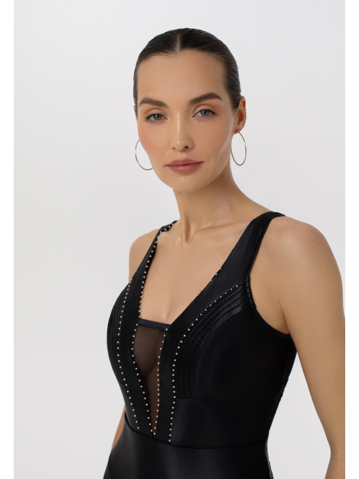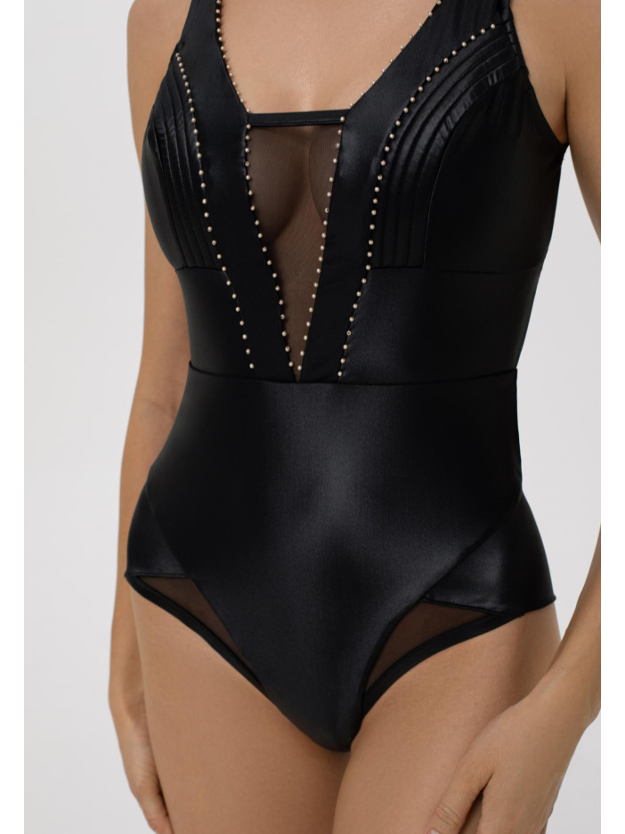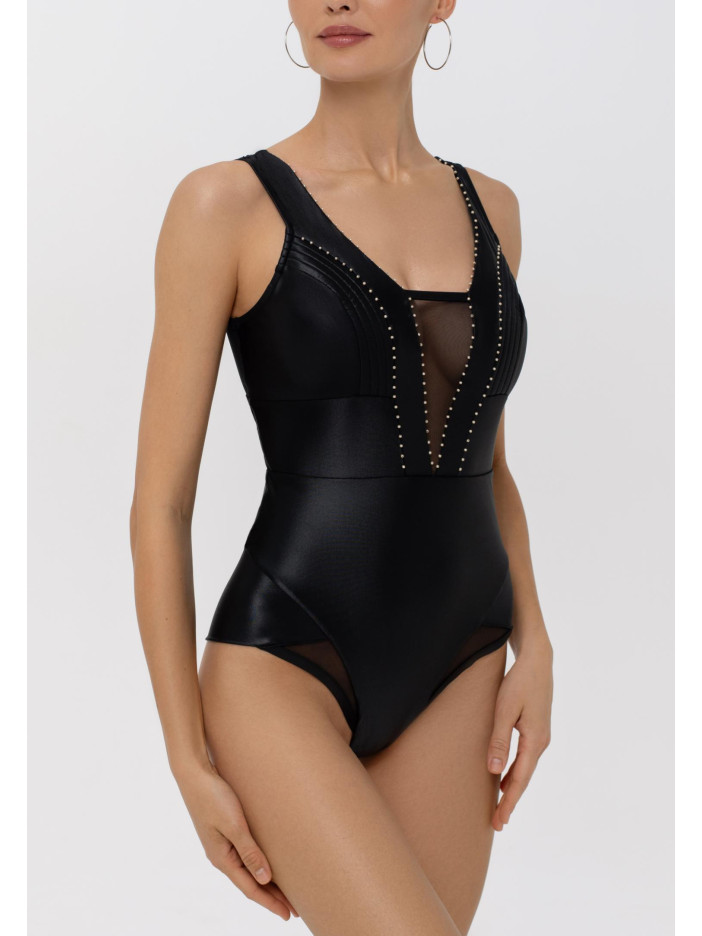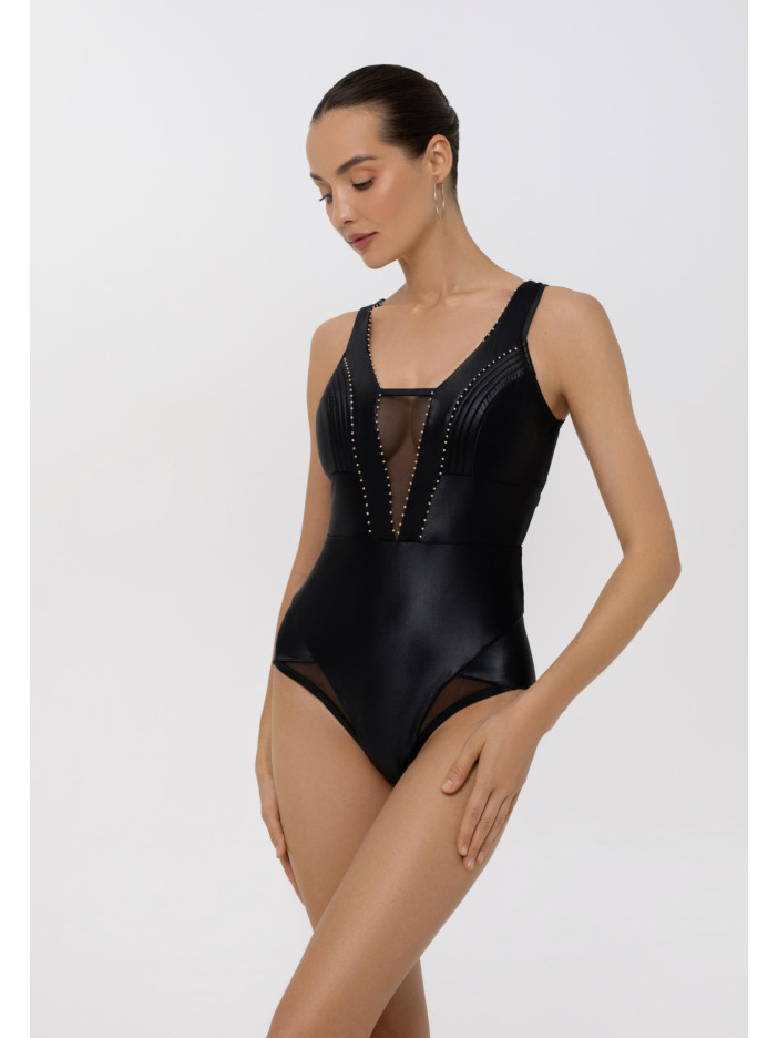 Легка ультрам’яка тканина з гладкою поверхнею та мерехтливим блиском у поєднанні з чуттєвою сіткою mesh створює сміливий жіночний образ рівня haute couture. Серія BLACK COUTURE — приклад сучасної універсальності, коли пляжна мода перетворюється на глянсовий шедевр. Суцільний купальник із м’якою чашкою без кісточок, глибокий виріз декольте прикрашений намистинами та вставкою з еластичної сітки, спина декорована сіткою, завищений виріз бікіні підкреслений вставками з сітки.