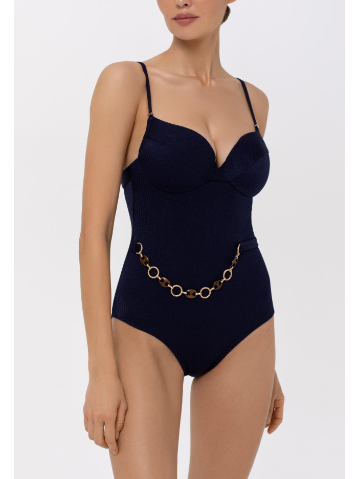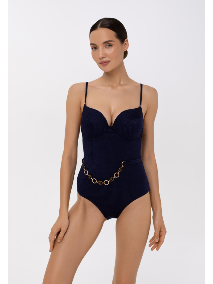 Суцільний купальник із формованими чашками на кісточках і знімними пуш-ап коректорами забезпечує ідеальну підтримку та виразний силует. Регульовані бретелі та застібка на спині гарантують комфорт, V-подібний виріз на спині додає елегантності, а декоративний пояс підкреслює лінію талії.