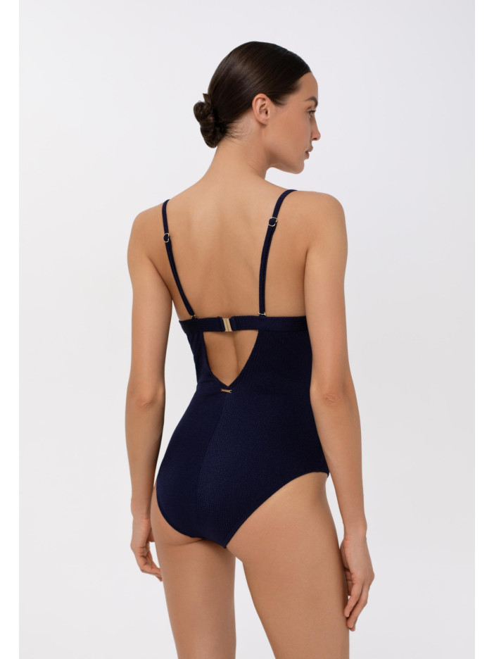 Відчуйте атмосферу невимушеної розкоші з купальником STELLA DI MARE — глибокий синій колір і вишукана жакардова текстура матеріалу створюють настрій відпочинку на яхті. Декоративні елементи у вигляді кручених кілець і дерев’яних аксесуарів додають стильного акценту з морським характером.