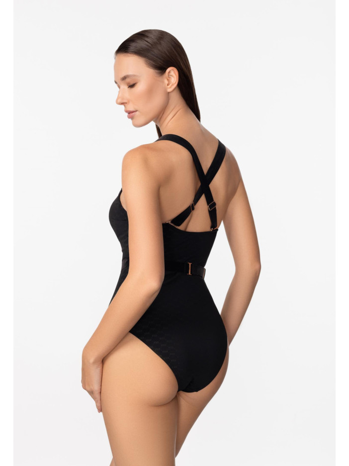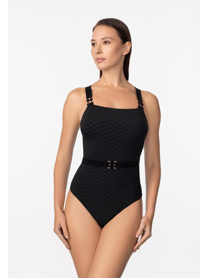 Втілення розкоші та витонченості — купальник з елегантної жакардової серії LUXURY FRAGRANCE від Marc & André. Вишуканий дизайн із фірмовим логотипом і оксамитовими вставками підкреслює жіночність та створює бездоганний образ у класичному чорному кольорі. Особливість моделі — інноваційна підкладка з мікрокапсулами, наповненими екстрактом чайного дерева, яка делікатно доглядає за шкірою та дарує відчуття свіжості й комфорту. М’які чашки на кісточках забезпечують гарну форму та надійну підтримку, а знімні коректори дозволяють регулювати посадку. Додатковий комфорт створює підтримуюча резинка під грудьми та регульовані бретелі з витонченим декором. Завершує образ знімний пояс з еластичного оксамиту, який додає особливого шарму та елегантності.