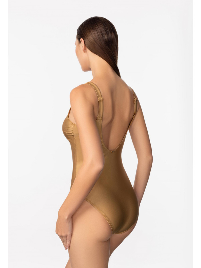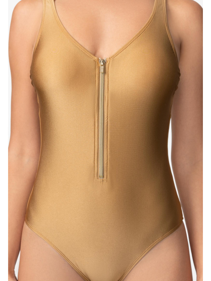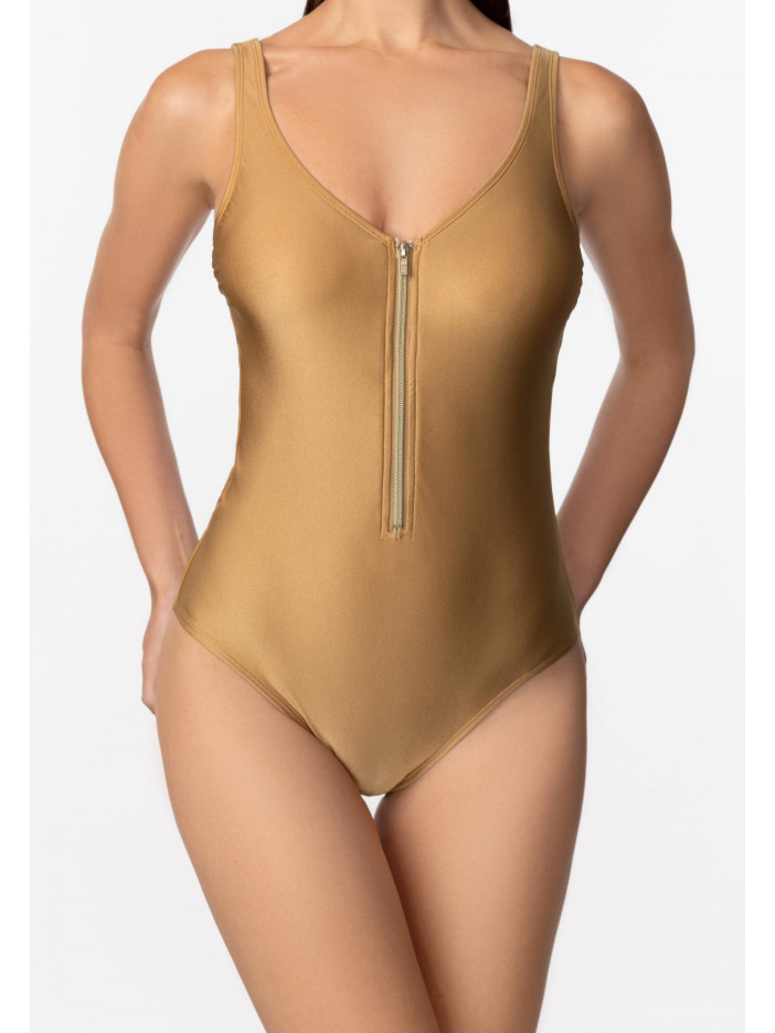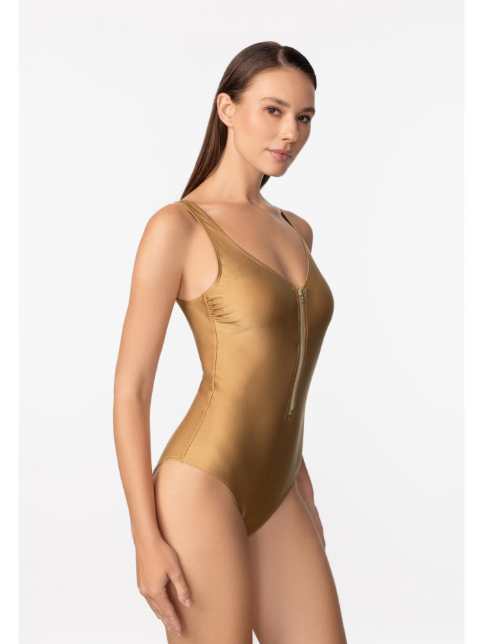 Шукайте купальник, у якому виглядатимете як ікона стилю? Сучасна мода народжується на стику спортивних трендів та елегантності! Сучасна, високотехнологічна тканина з волокнами Econyl стійка до впливу ультрафіолетових променів, хлору, сонцезахисних кремів та олій. Суцільний купальник без кісточок. Тонкі вшиті коректори та підтримуюча еластична стрічка під грудьми. Ефектна силіконова застібка-блискавка. Класичний виріз бікіні. Широкі бретелі регулюються по висоті та відстібаються на спині, що дозволяє носити купальник із різними варіантами фіксації бретелів. Круглий глибокий виріз на спині