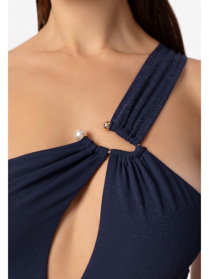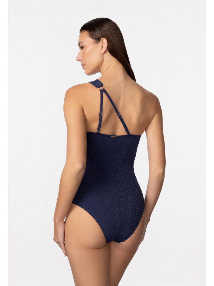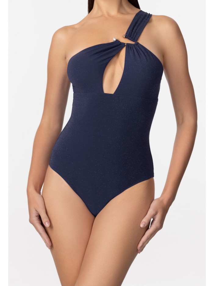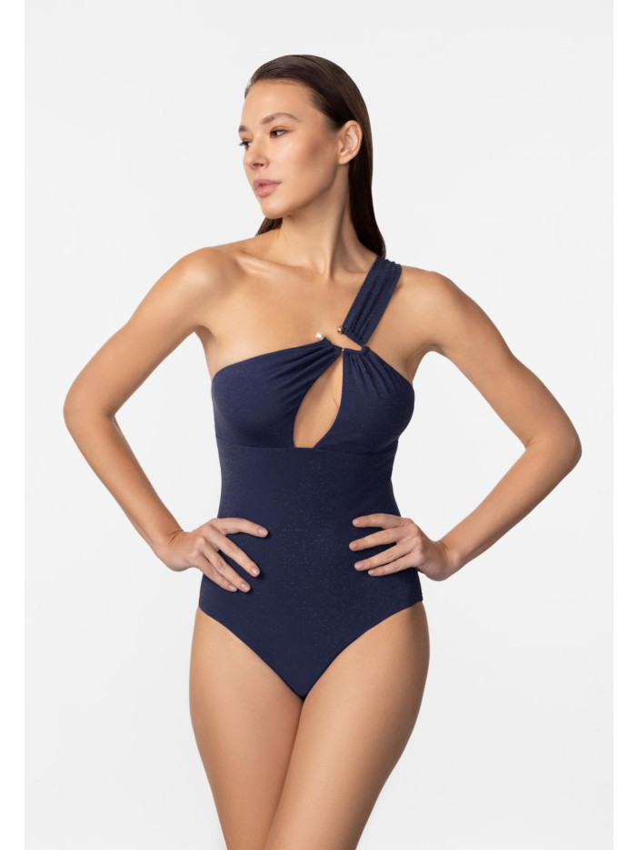 Серія MIDNIGHT RAIN надихнута загадковою красою ночі. Глибокі темно-сині відтінки, наче оксамитове небо після дощу, підкреслені м'якими драпіруванням і легким блиском сріблястої нитки, що пронизує тканину. Асиметричний крій, золоті аксесуари з перлинними акцентами та підкладка в тон створюють відчуття витонченої гармонії та бездоганного стилю. Купальник із асиметричним кроєм по лінії декольте створює спокусливий силует. Тонкі вшиті коректори забезпечують легку підтримку та акуратну форму грудей. Широка асиметрична бретель спереду, зафіксована на аксесуарі, додає оригінальності, а дві тонкі бретелі, що регулюються, на спині гарантують ідеальну посадку і комфорт.