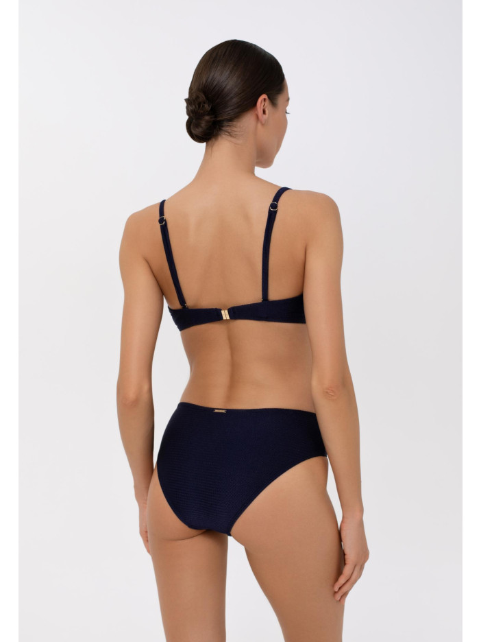 Елегантна невимушеність і морський шик втілилися в купальнику STELLA DI MARE. Глибокий синій колір і розкішна жакардова текстура налаштовують на довгоочікувану відпустку, а чергування декоративних елементів — кручені кільця та дерев’яні акценти — додає легкого морського стилю.