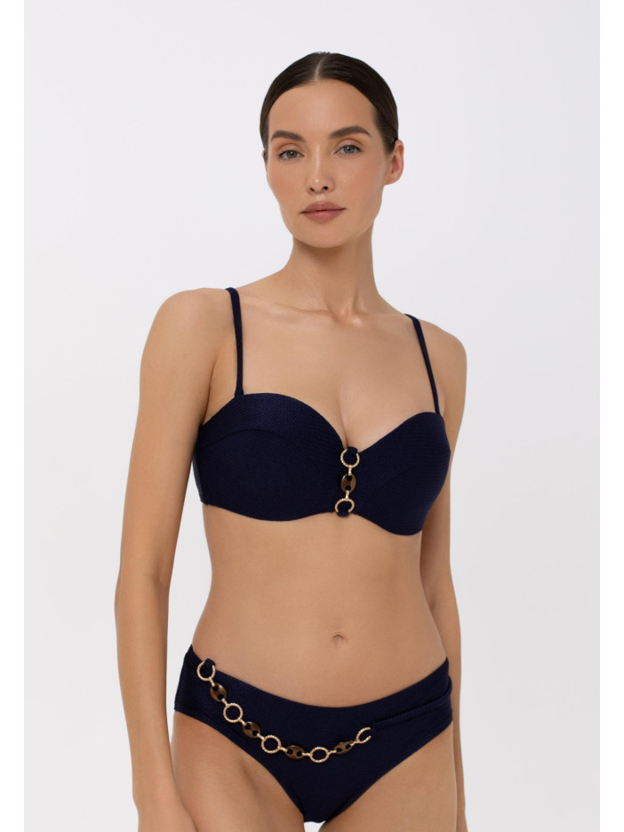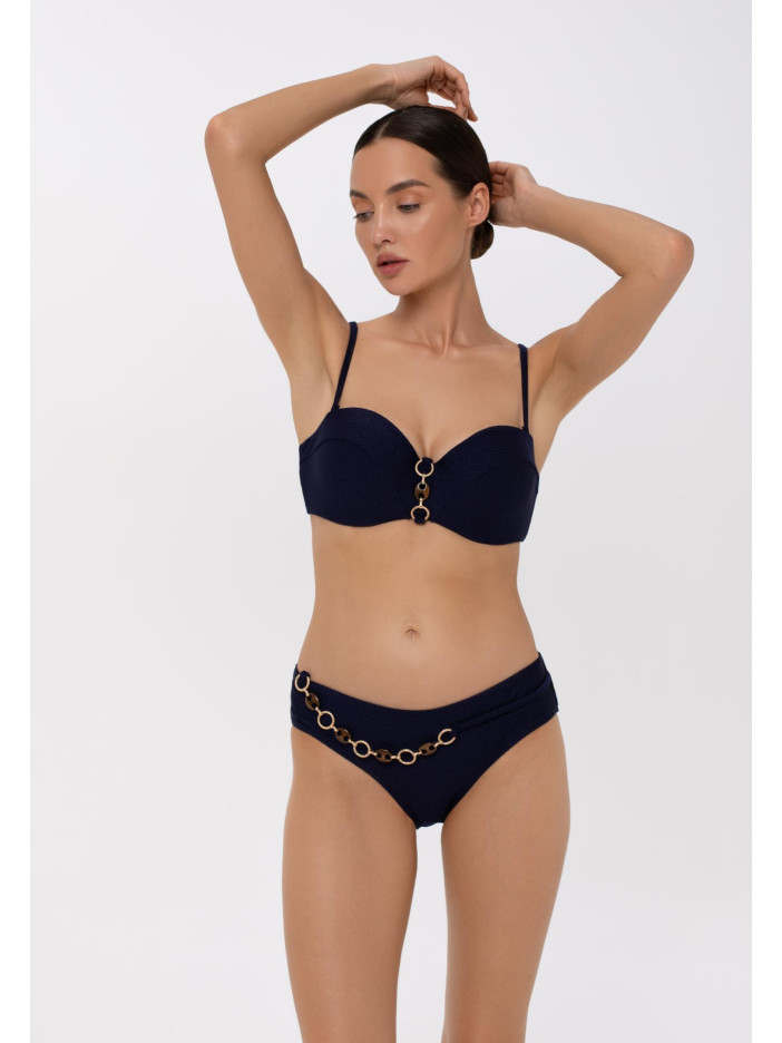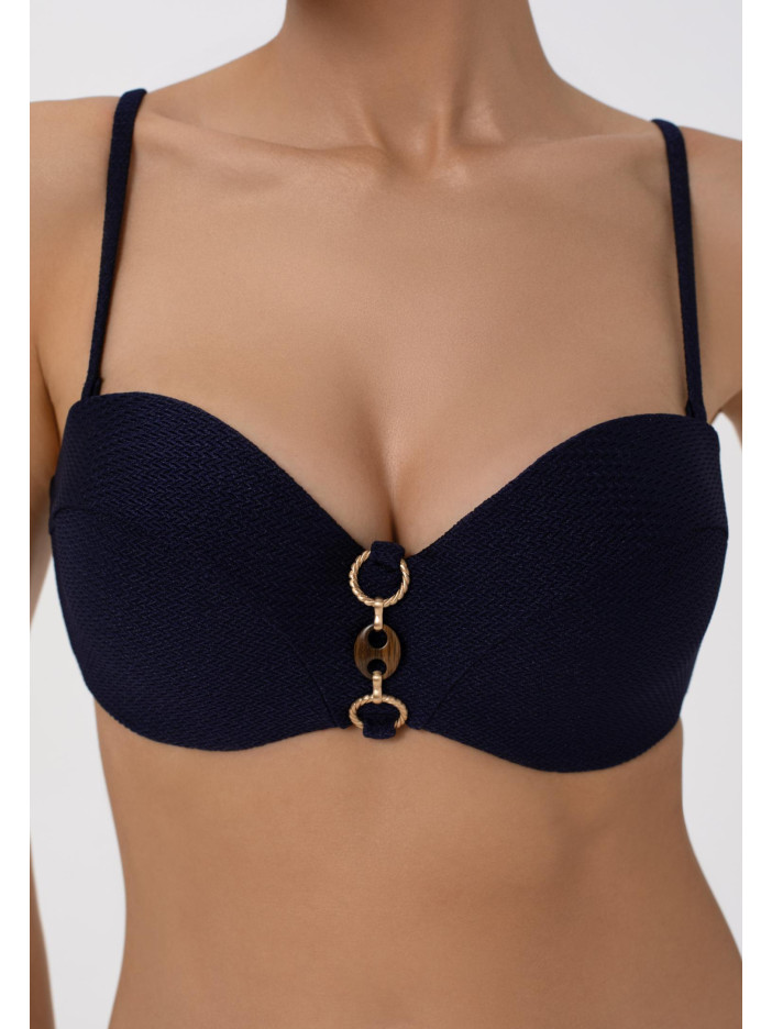 Верх купальника з формованими чашками «бандо» на кісточках, по центру — стильний аксесуар. Знімні регульовані бретелі та застібка на спині забезпечують комфорт і ідеальну посадку.