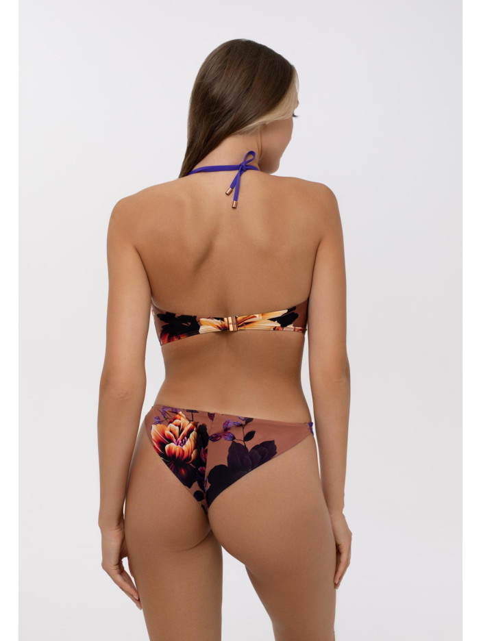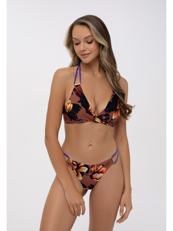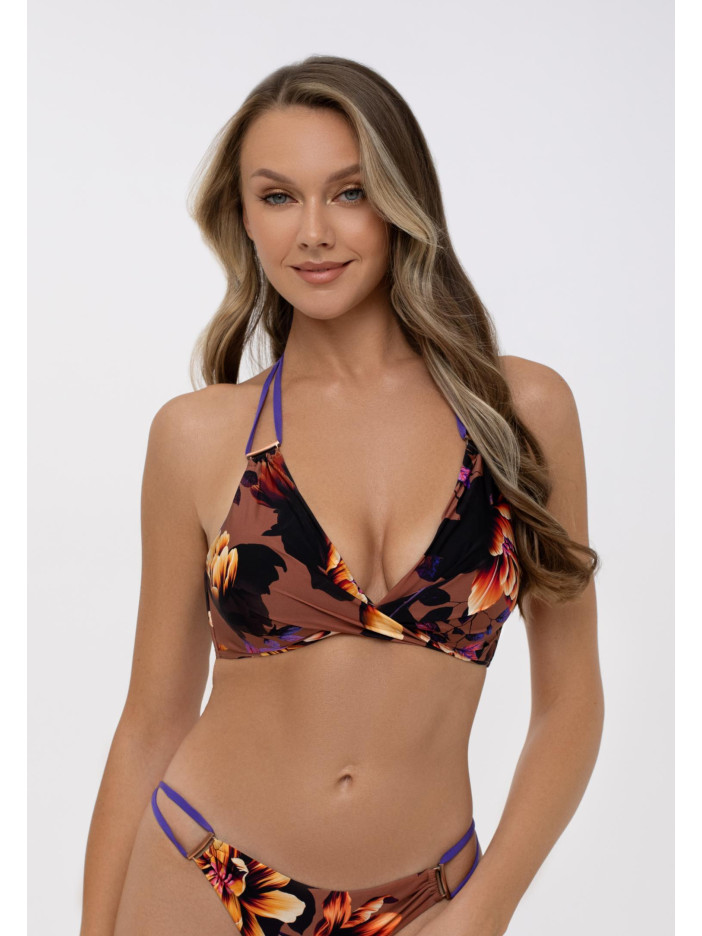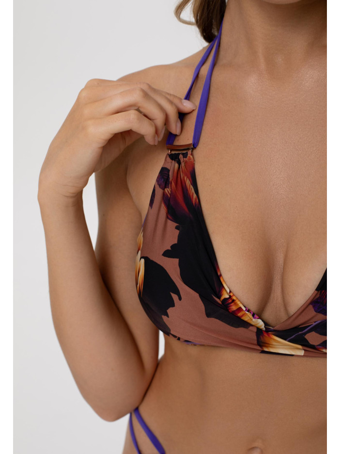 Пориньте у світ вишуканої флористики з верхом купальника FLOWER MANIA — багатошаровий принт від італійських художників розкриває красу листя шипшини, тюльпанів і троянд на теплому теракотовому фоні. Лілова підкладка та аксесуари кольору рожевого золота створюють м’який і стильний контраст.