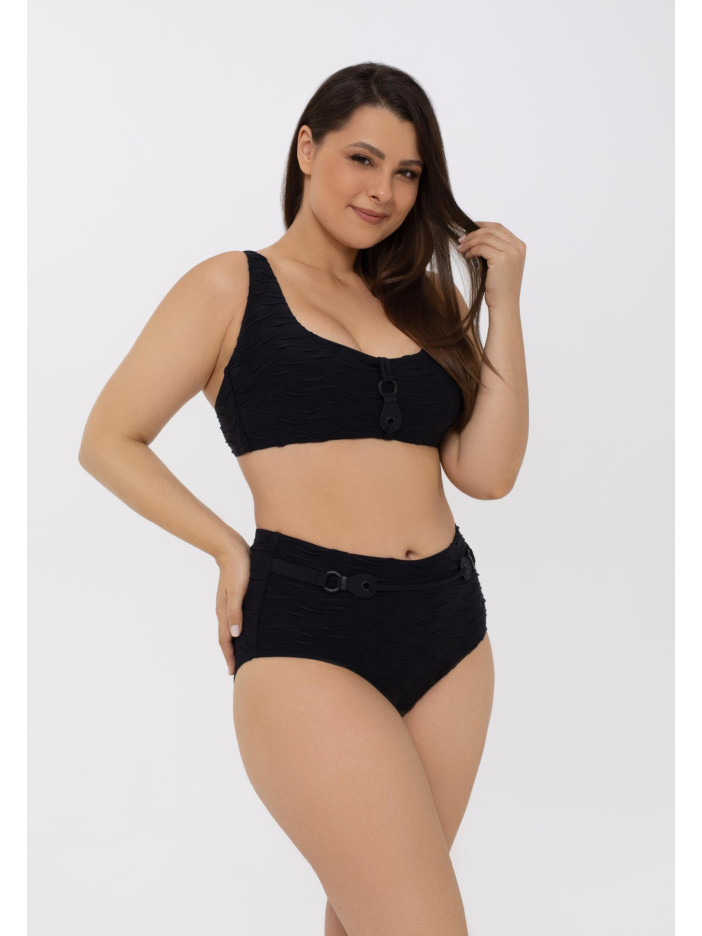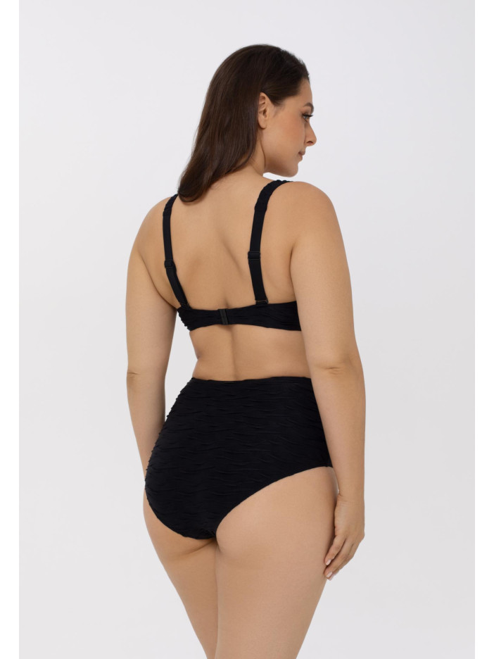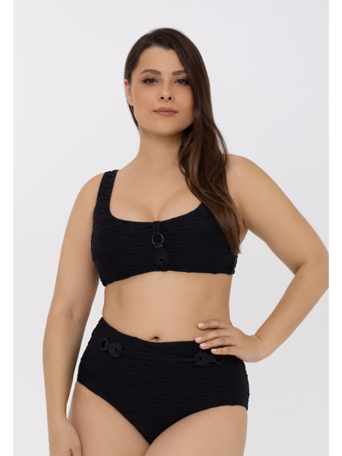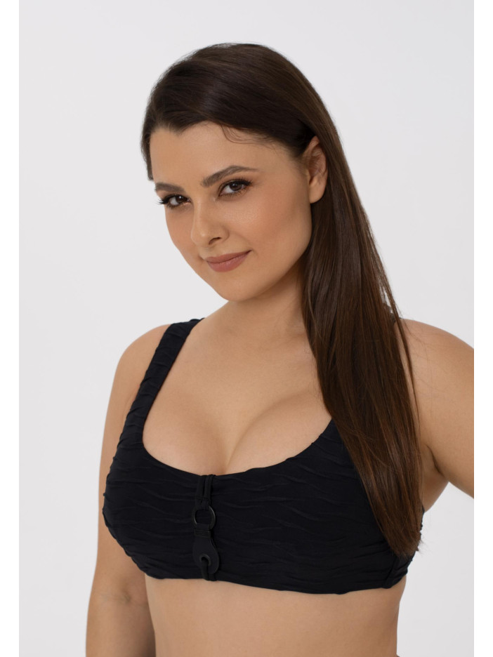Вічна класика поєднується з сучасним стилем у купальнику із серії FRENCH CODE «чорне на чорному»! Однотонна тканина з багатою текстурою прикрашена рельєфними хвилястими жакардовими смужками, створюючи спокусливий та витончений ефект, смарагдово-зелена підкладка з сатиновим блиском і чорні матові аксесуари додають оригінальний акцент і роблять морську тематику багатогранною. М’яка чашка з тонкими знімними коректорами на кісточках ідеально підходить власницям пишних форм, виріз каре по лінії декольте підкреслює жіночність, регульовані широкі бретелі та застібка на спині забезпечують комфорт і впевненість у кожній деталі.