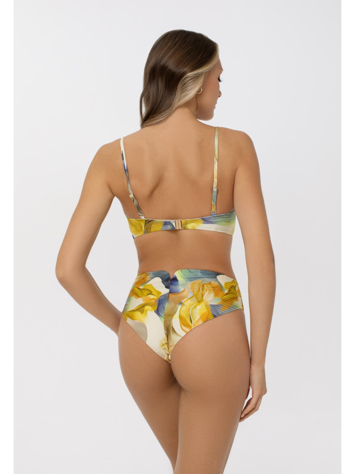 У повній відповідності з назвою серії SYMPHONIE ці моделі відтворюють м’який рух хвиль, що виконують вічну морську симфонію. У центрі уваги — химерний принт, у якому відтінки плавно переходять один в одного в акварельній техніці, створюючи відчуття живої динаміки. Полотном для акварелі слугує еластичний трикотаж із ніжною тонкою рубчиком текстурою, який м’яко облягає фігуру. Поєднання напівспортивних елементів крою та витонченої лінії декольте підкреслює переваги силуету.