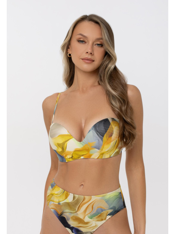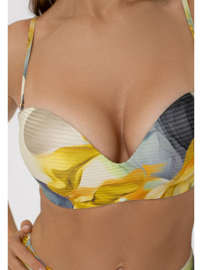 Безкаркасна чашка-бандо з вбудованим «Super пуш-ап» створює ефект прихованого каркаса, забезпечуючи комфортну та надійну підтримку. Усередині силіконова стрічка по верхньому краю для фіксації. Регульовані знімні бретелі. Застібка на спині.
