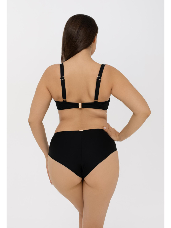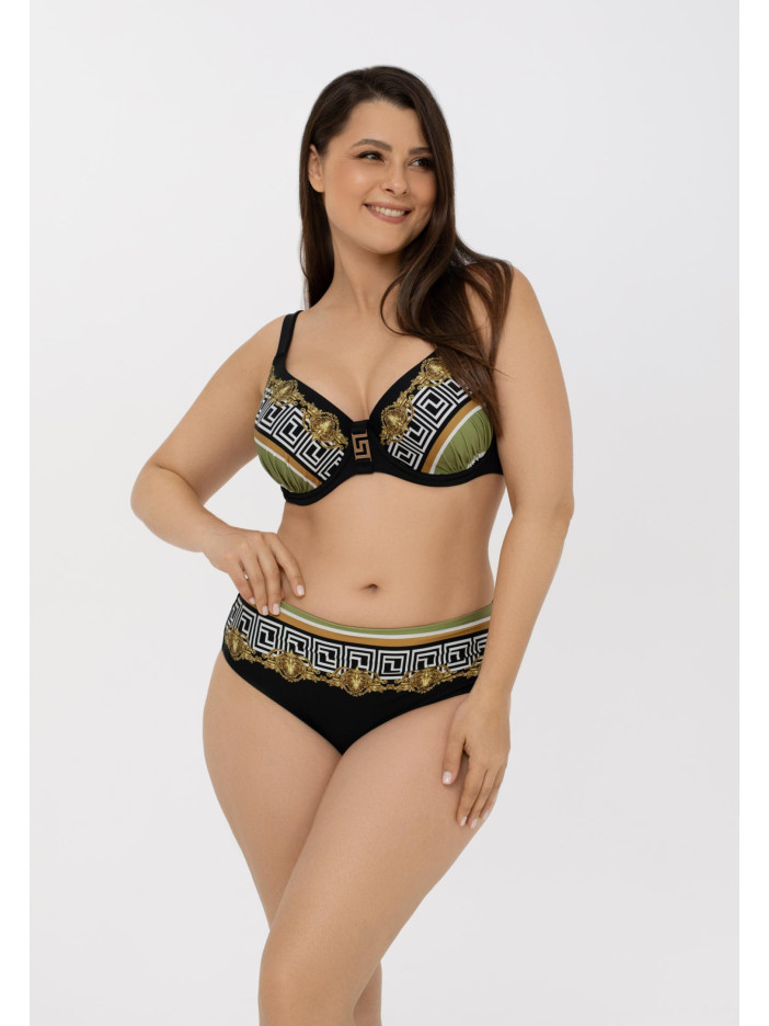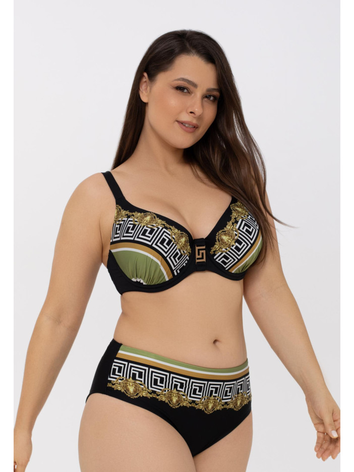 Геометричний орнамент у золотих тонах, натхненний епохою Бароко, створює вишукані узори серії BAROQUE TWIST. Гірчично-жовті та зелено-жовті смуги на чорному фоні підкреслюють контрастну розкіш тканини Jersey Lomellina від європейського виробника. Верх купальника з формованими чашками на кісточках ідеально підійде власницям пишних форм. Регульовані бретелі та застібка на спині забезпечують комфорт та ідеальну посадку. Стильний аксесуар між чашками і ефектний «Placement» принт спереду додають образу завершеності та елегантності.