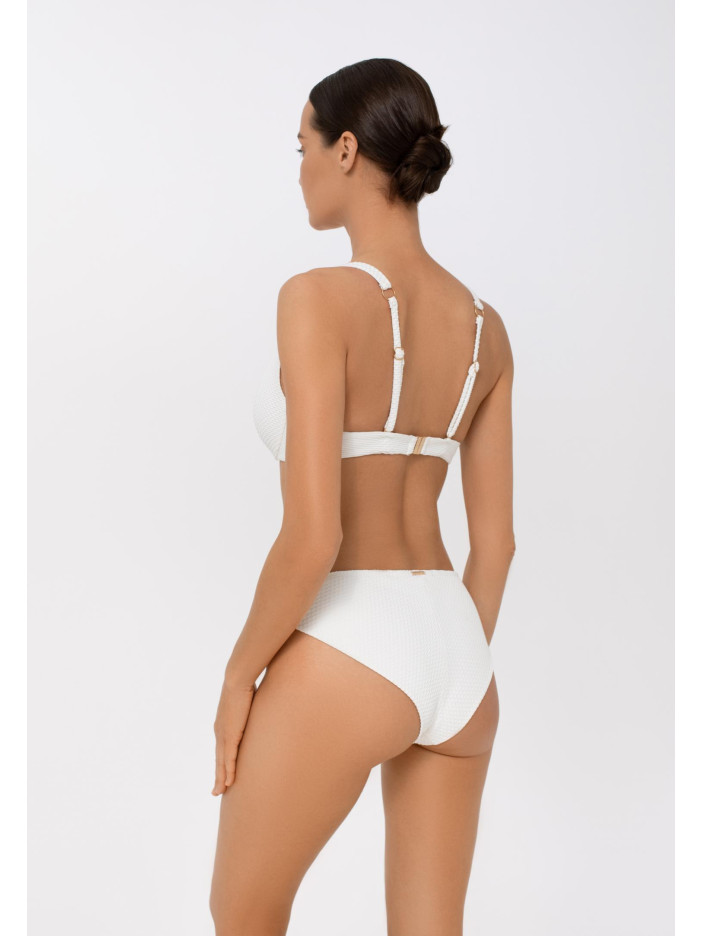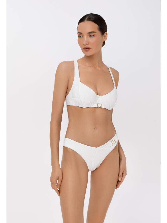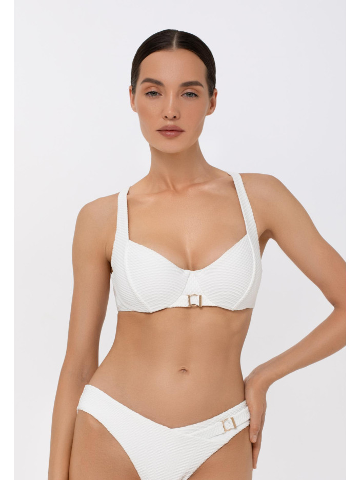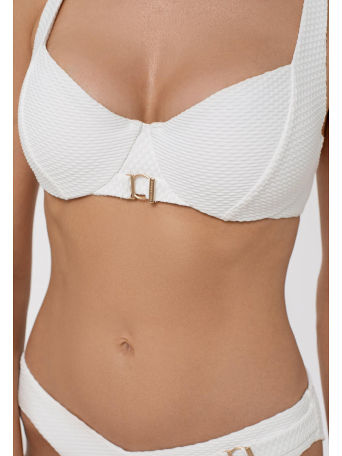 Купальник із серії PURE AFFECTION у вишуканому білому кольорі — це втілення ніжності та елегантності. Фактурний матеріал і золоті аксесуари створюють розкішний образ у стилі Французької Рив’єри, де панують жіночність і витончений шик. Верх із м’якими чашками на кісточках забезпечує комфорт і підтримку, а поглиблене декольте додає привабливості. Широкі регульовані бретелі та акцентний аксесуар спереду гармонійно завершують образ. Застібка на спині гарантує ідеальну посадку — для тих, хто звик бути в центрі захоплених поглядів.