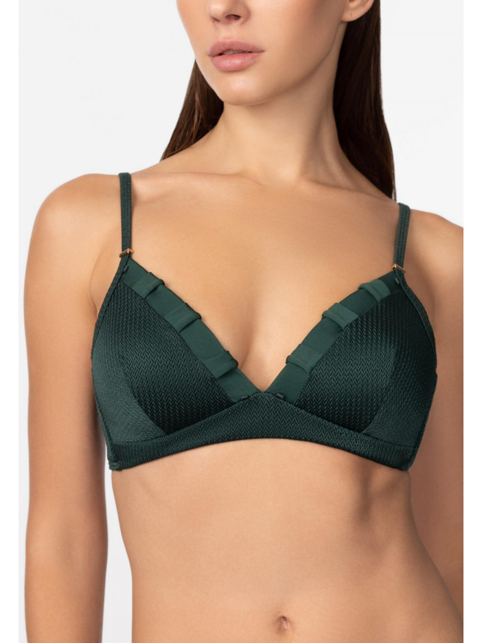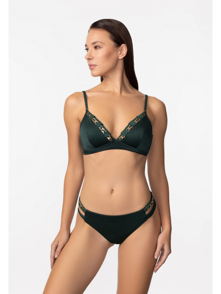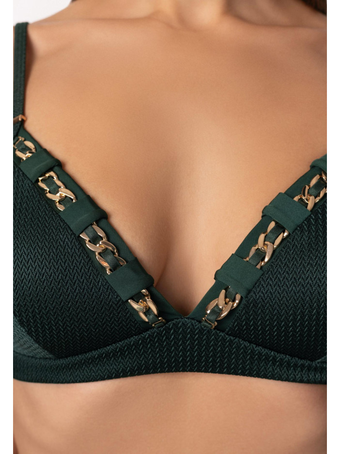 MODERN ELEGANCE — серія, в якій стримана простота перетворюється на витончену розкіш. Глибокий темно-зелений жаккард з візерунком «ялинка» і благородною текстурою створює гармонійний і вишуканий силует. Знімні декоративні ланцюжки додають образам гнучкості і характеру, вносячи зухвалий акцент. Формована трикутна чашка створює акуратний і підтримуючий силует. Регульовані бретелі, що фіксуються на спині. Розширений стан додає додаткову підтримку, а верх чашок прикрашений атласною обшивкою з петлями для знімного декоративного ланцюжка, надаючи образу елегантність і вишуканий акцент.