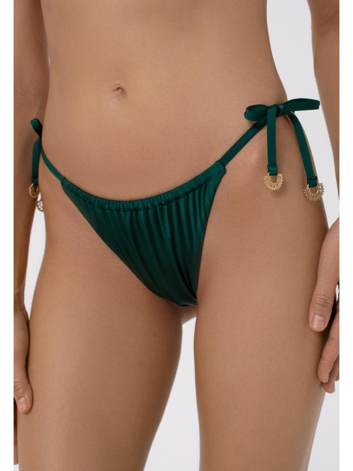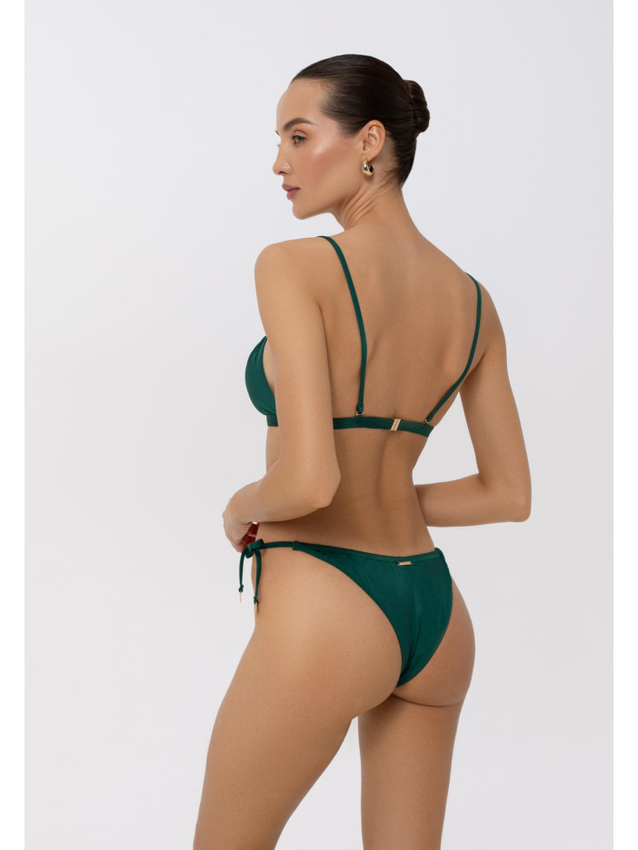 Залишаючись в елегантному тренді, який із глибоких темних відтінків обрати? Звичайно, смарагдово-зелений! Купальники серії CAPRICIOUS виготовлені з екологічного матеріалу з ультрагладкою поверхнею, завдяки якій насичений зелений відтінок красиво переливається під променями сонця. Ідеальний баланс між комфортом та розкішшю, практичним та бажаним! Жіночі плавки-міні бразиліана із заниженою лінією талії на тонких зав’язках підкреслюють фігуру, підвищений виріз бікіні додає сміливості, а обробка задньої деталі у підворіт із чистим краєм забезпечує акуратний та завершений вигляд.