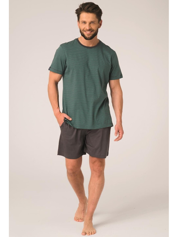Чоловіча піжама Key — ідеальний вибір для чоловіків, які цінують комфорт, свободу рухів і сучасний повсякденний стиль, виконана з м’якої та приємної до тіла тканини на основі бамбука, яка добре пропускає повітря та забезпечує максимальний комфорт під час сну і відпочинку, комплект включає футболку з короткими рукавами у стильну контрастну смужку та однотонні шорти вільного крою, футболка доповнена класичним круглим вирізом із контрастною окантовкою, що надає образу динамічності та спортивного вигляду, шорти мають еластичний пояс, який забезпечує зручну посадку і комфорт протягом усієї ночі, завдяки універсальному дизайну та гармонійному поєднанню кольорів ця піжама чудово підходить як для сну, так і для домашнього відпочинку, підкреслюючи стиль і забезпечуючи максимальну зручність щодня