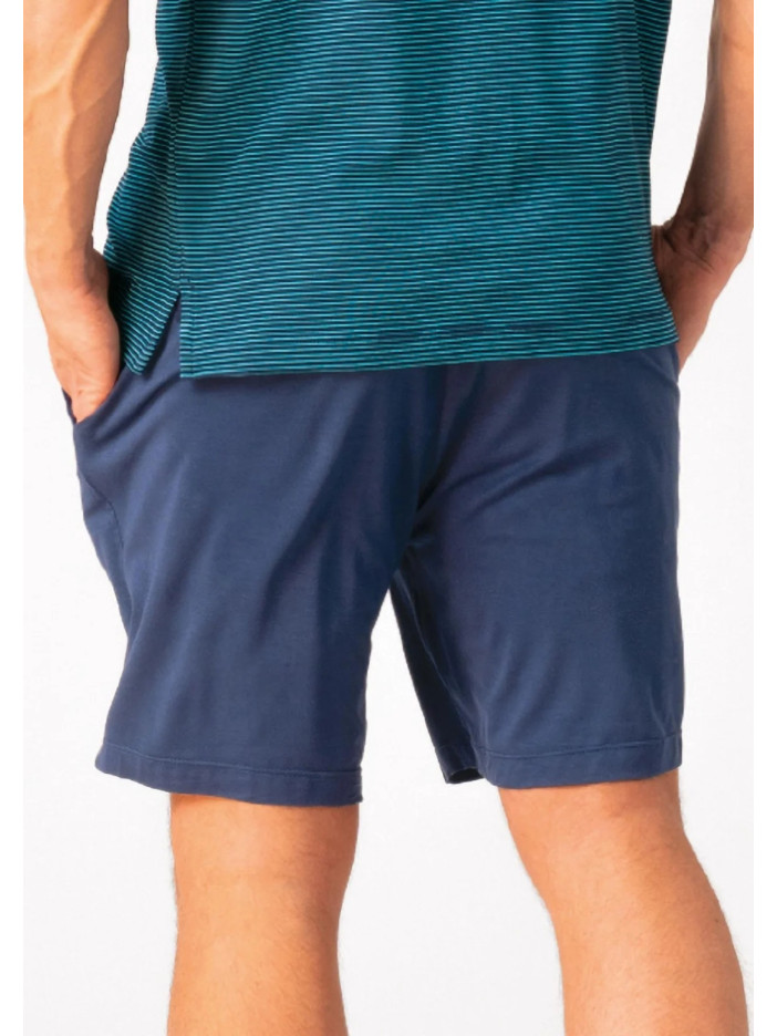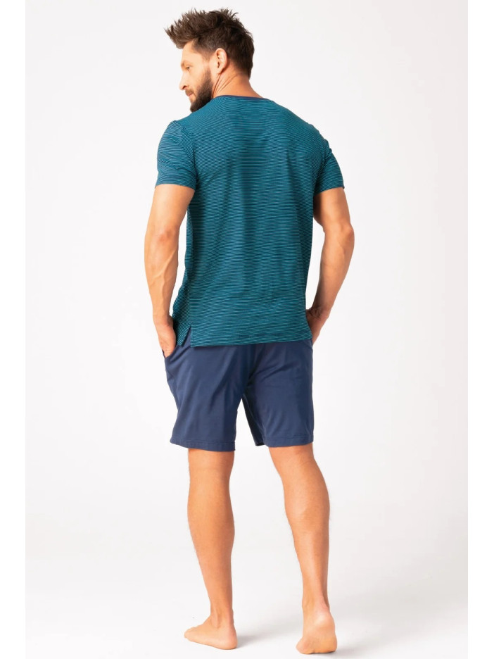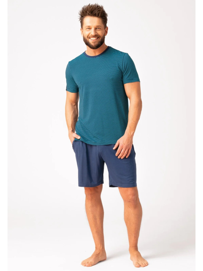 Стильна чоловіча піжама — ідеальний вибір для комфортного сну та затишного відпочинку, виконана з м’якої та дихаючої бавовни, яка забезпечує приємні відчуття на тілі та комфорт протягом усієї ночі, комплект складається з футболки прямого крою з короткими рукавами та круглим вирізом, виконаної у сучасну тонку смужку в насиченому синьо-зеленому відтінку, а також однотонних темно-синіх шортів вільного крою зі зручною посадкою, модель поєднує лаконічний дизайн і практичність, підкреслює стиль та чудово підходить як для дому, так і для відпочинку в подорожах