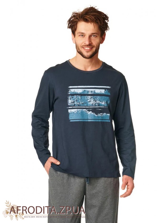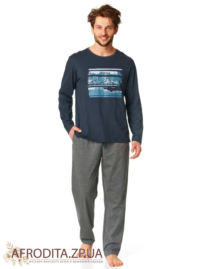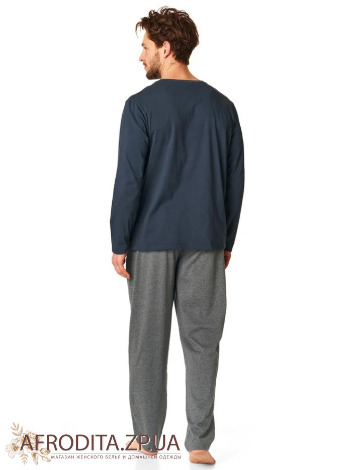 Чоловіча піжама класичної форми. Піжама повністю виготовлена з надзвичайно м'якої високоякісної бавовняної тканини. Толстовка з круглим вирізом горловини оброблена трикотажною ризинкою. По низу толстовки бічний розріз фіксується декоративною тасьмою бавовни. Штани зі злегка звуженими штанинами на талії мають зручну, м'яку ризинку. Бавовняні зав'язки дозволяють регулювати ширину ременя відповідно до потреб тіла. Глибокі кишені з боку.