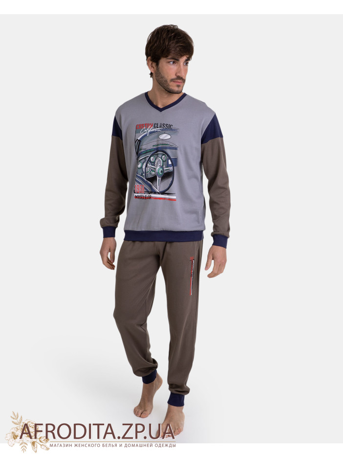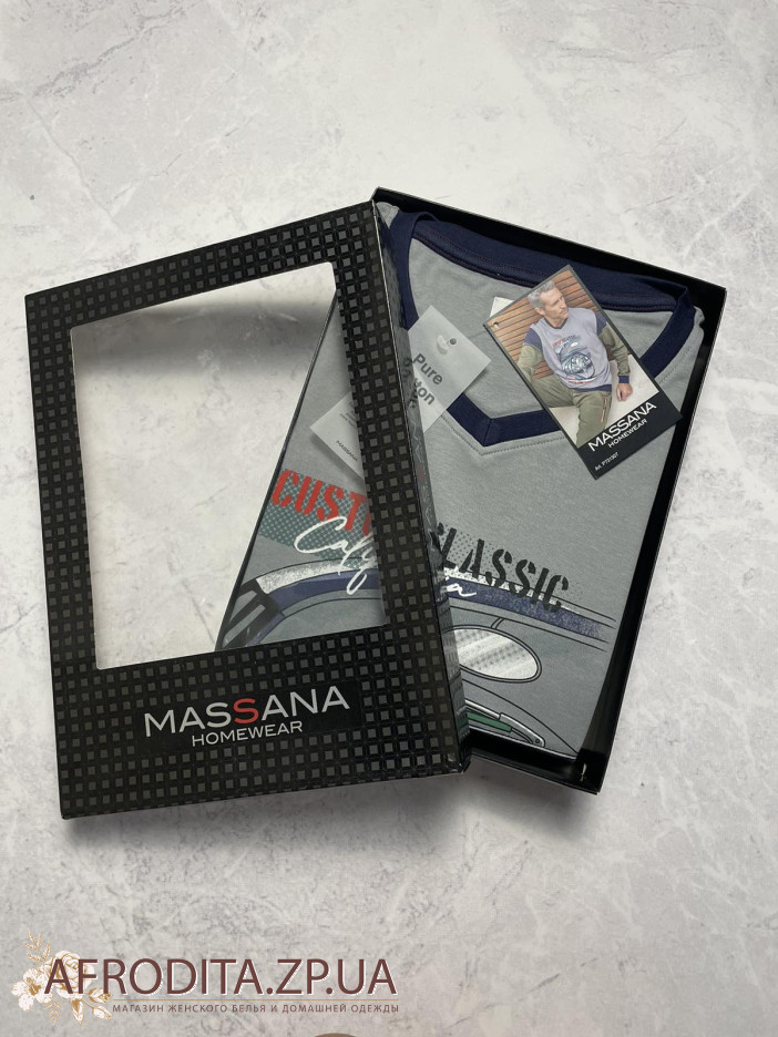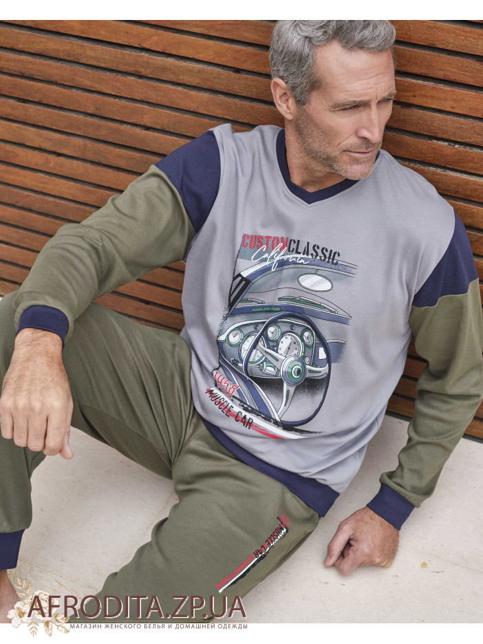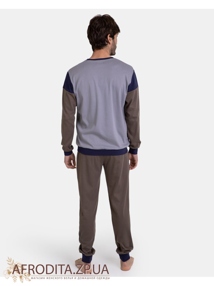 Тепла чоловіча піжама Massana P731307 із натуральної бавовни від іспанського бренду Massana. Комплект складається з кофти з довгим рукавом, низ кофти та манжет декорований синьою тканиною. Штани прямого крою із бічними кишенями.