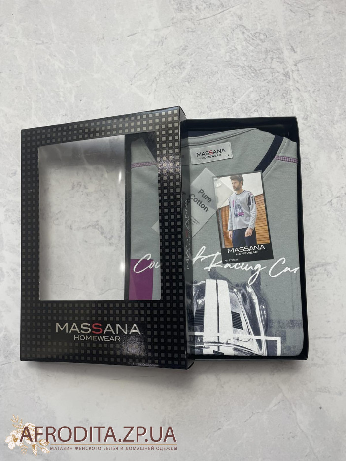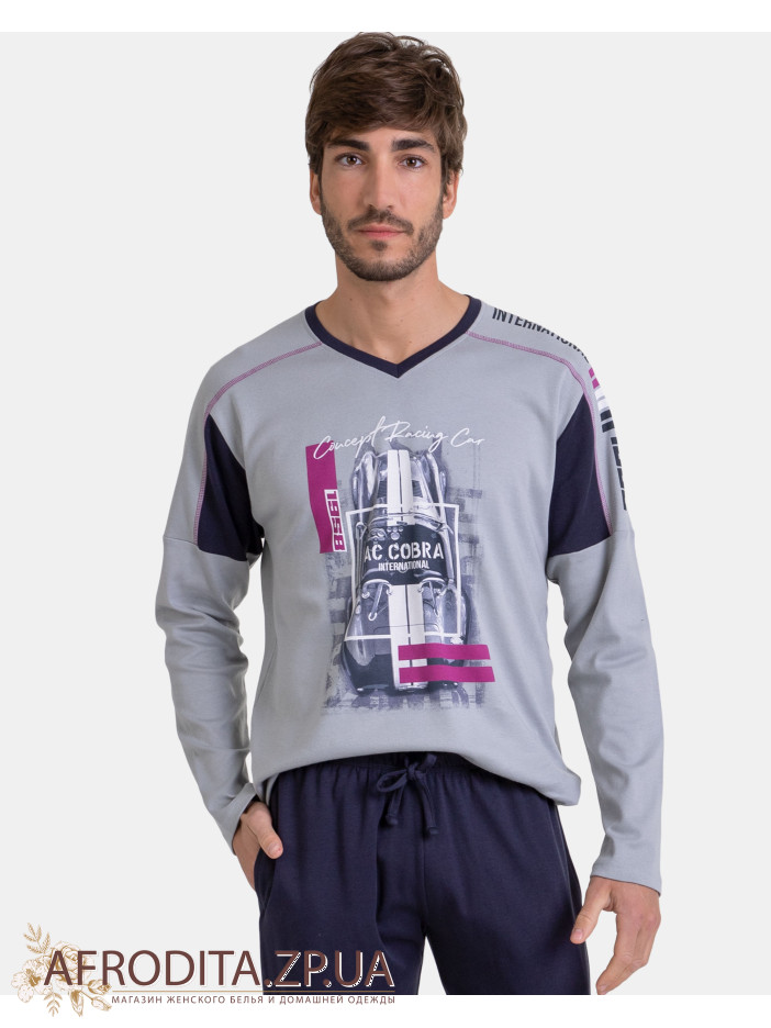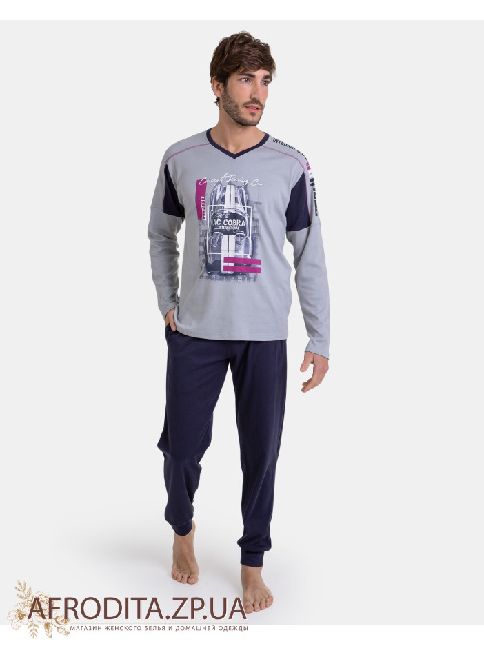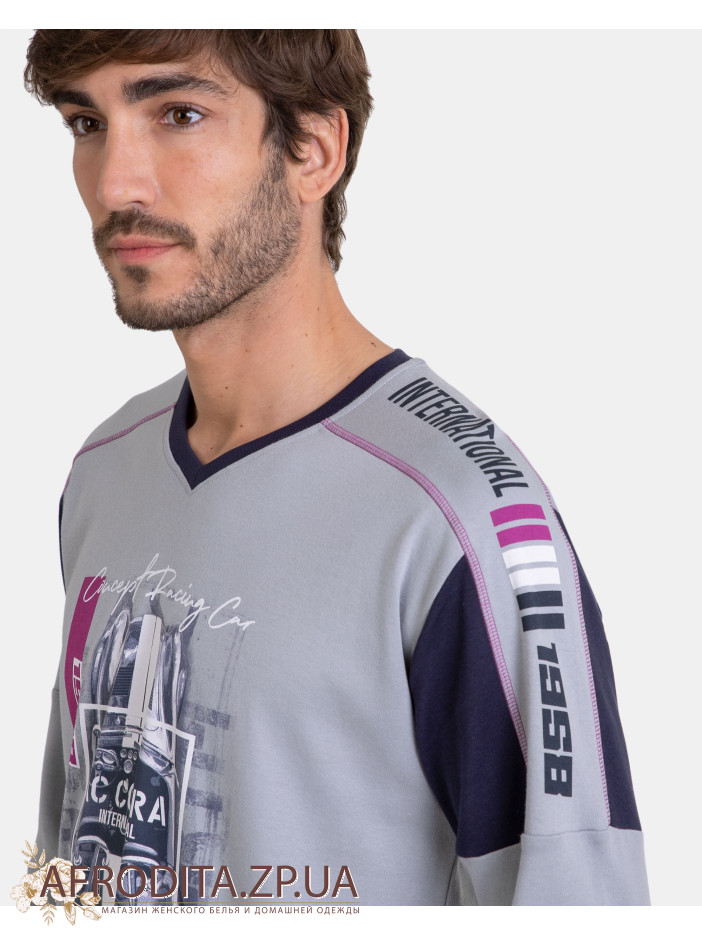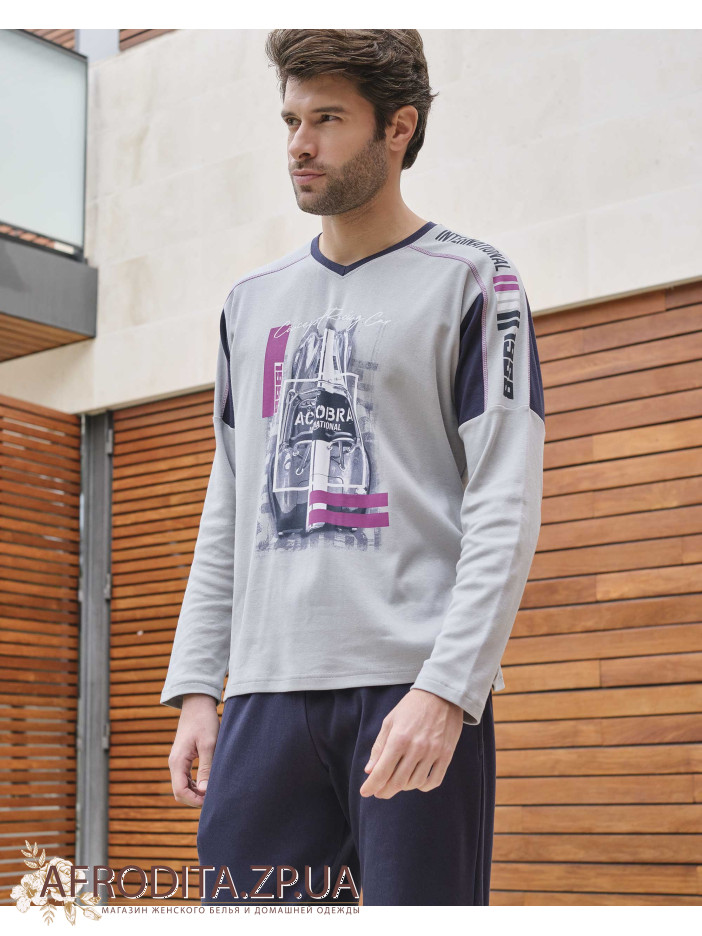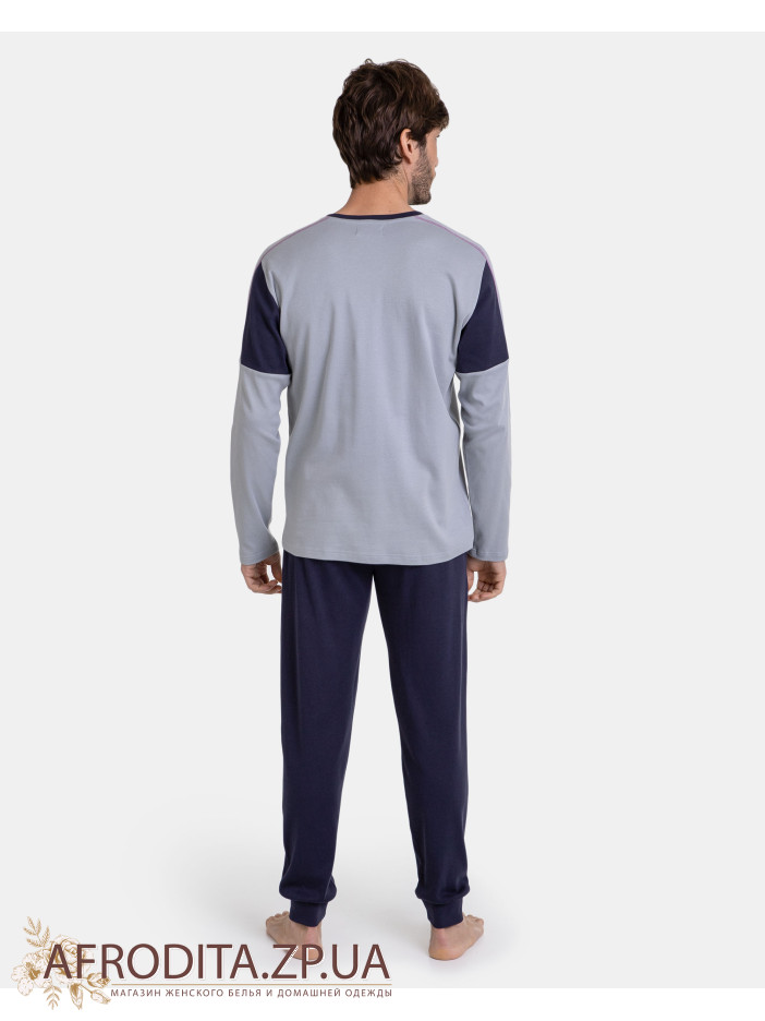 Стильний чоловічий домашній комплект Massana P731329 із натуральної бавовни. У комплект входить джемпер із довгими рукавами, горловина М-подібної форми. Штани прямого крою з кишенями, лінія талії регулюється зав'язками.