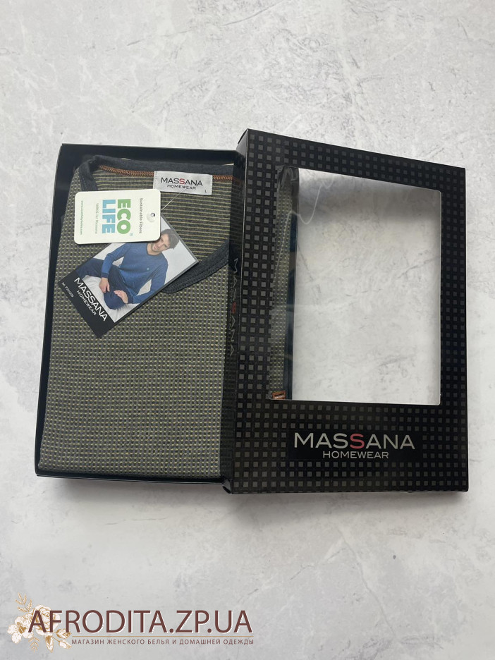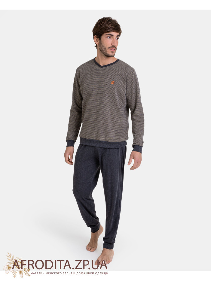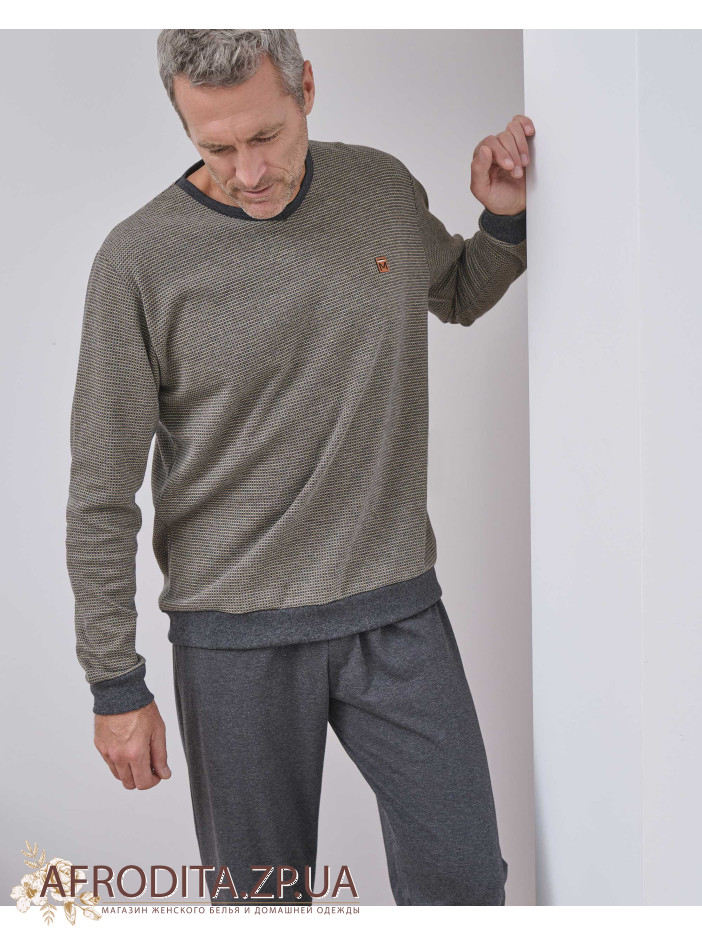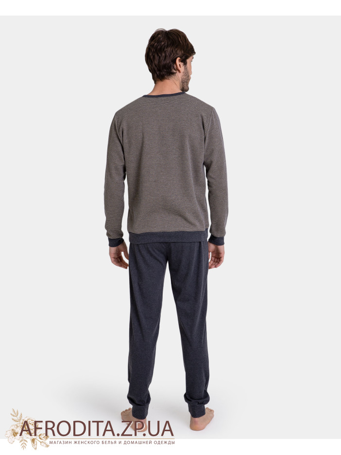 Чоловіча піжама з брюками Massana P731339 виготовлена з бавовняної тканини. Комплект складається з кофти з довгим рукавом, манжети та нижня честь декоровані сірою тканиною у тон штанів. Штани однотонні прямого крою.