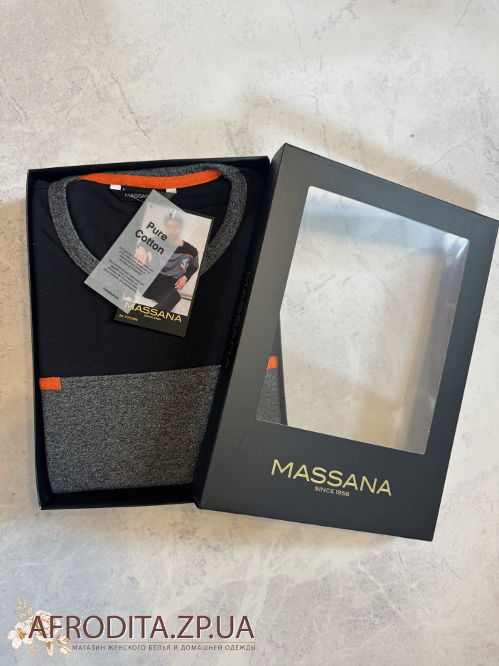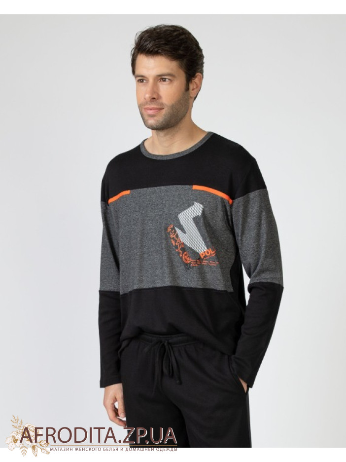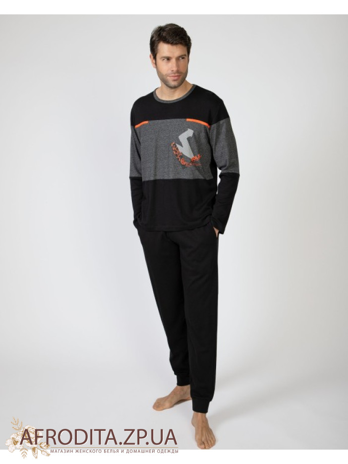 Чоловіча піжама для дому та відпочинку Massana P751306 із 100% високоякісного бавовняного трикотажу. Комплект складається з джемпера з довгими рукавами та принтом, круглим вирізом горловини та контрастними вставками на рукавах та спереду. Штани з манжетами, бічними кишенями та еластичним поясом.