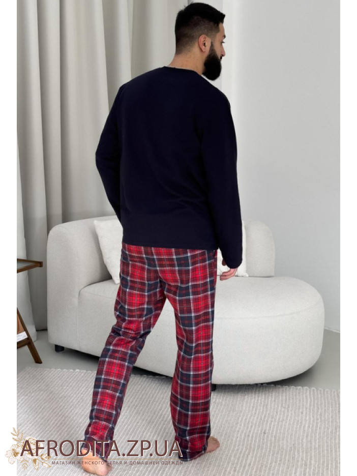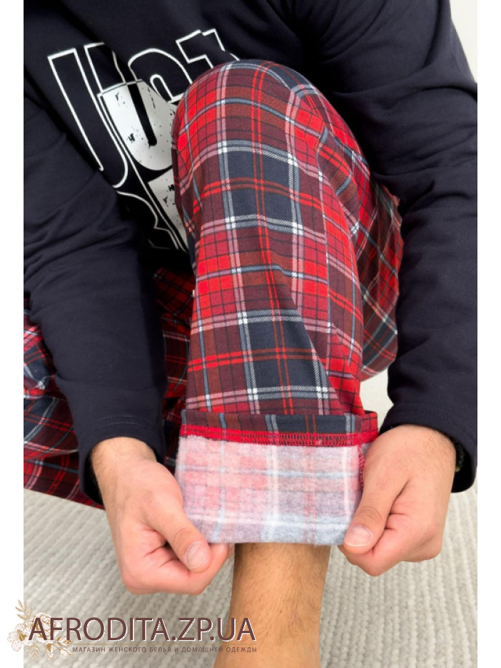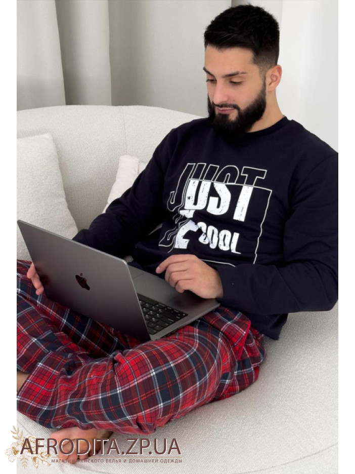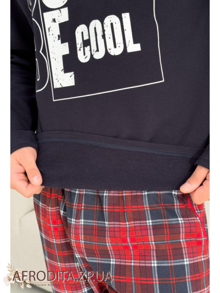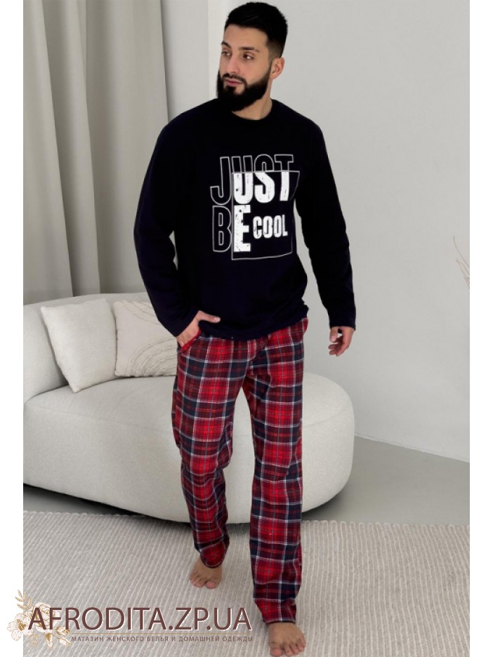 Чоловіча стильна піжама зі штанами KMW07 від українського бренду Cpsy виготовлена ​​з м'якої та дуже приємної до тіла бавовни. Комплект складається із однотонної кофти темно-синього кольору з довгими рукавами, горловина має округлу форму. По центру джемпера як декор розташований напис "Just Be Cool".  Штані прямого крою на резинці у червону шотландську клітку, у бічних швах розташовані кишені. Костюм виглядає дуже стильно і може стати хорошим подарунком близькій людині.