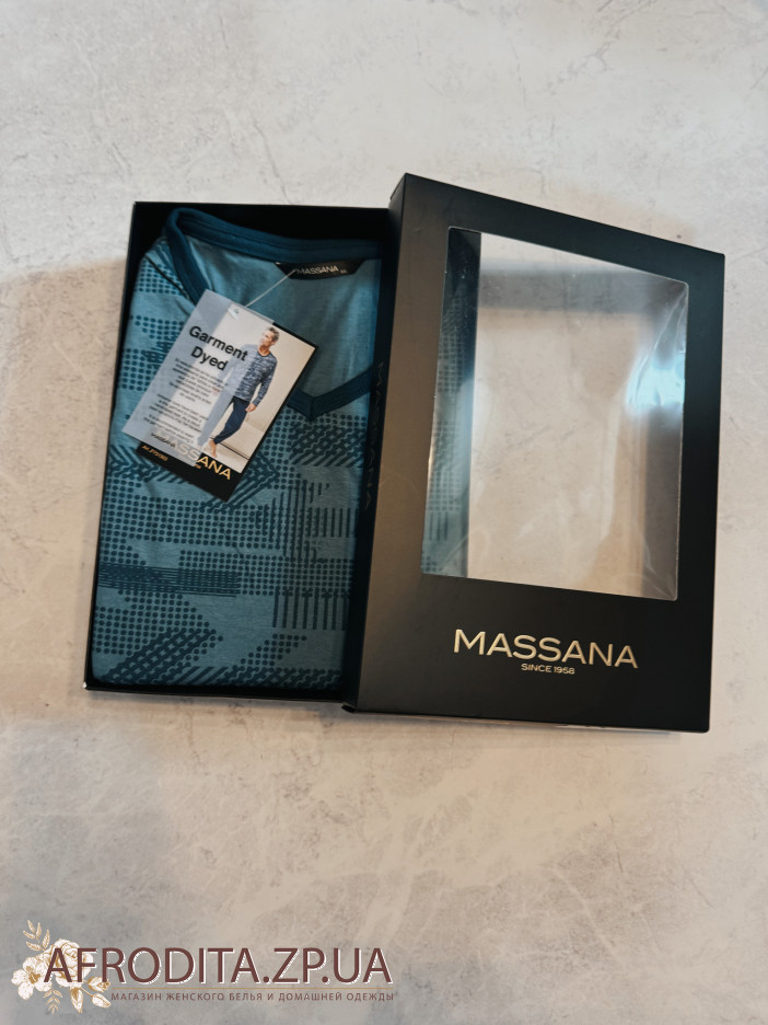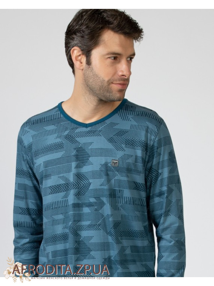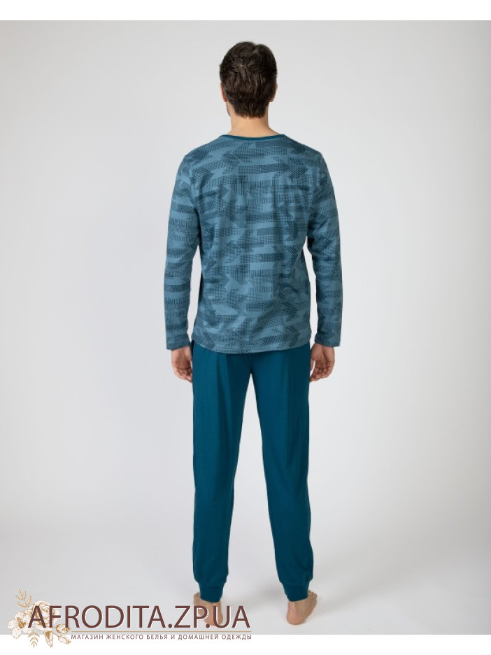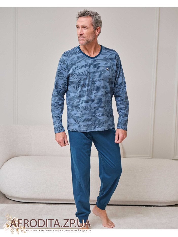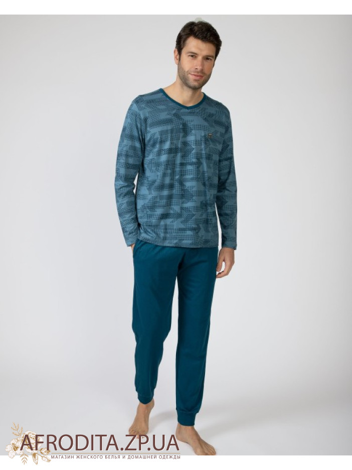 Чоловіча піжама зі штанами Massana P751303 виготовлена з високоякісного 100% бавовняного трикотажу. Комплект складається з джемпера з довгими рукавами, принтом по всій поверхні та V-подібним вирізом. Штани однотонні на гумці в поясі, низ з манжетами, з боків розташовані кишені.