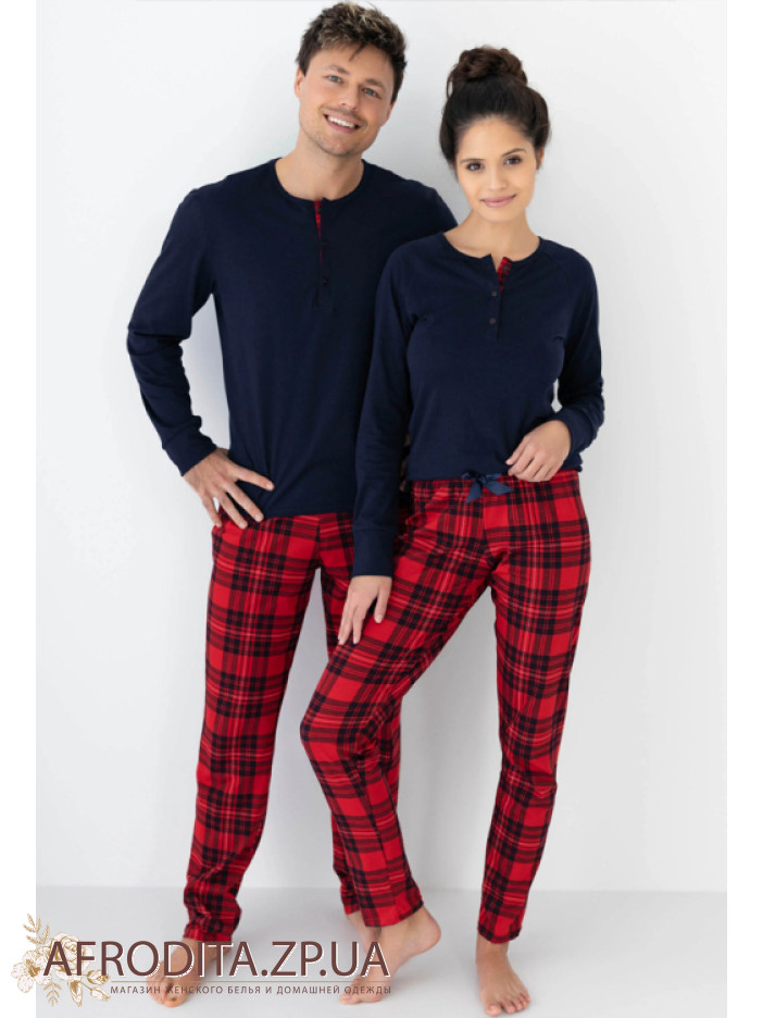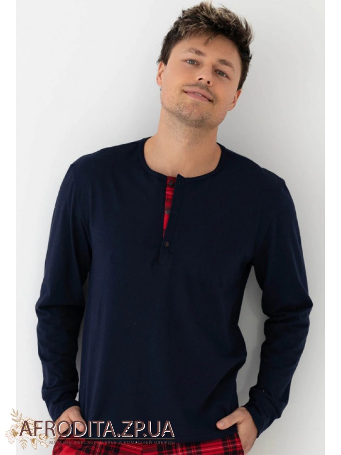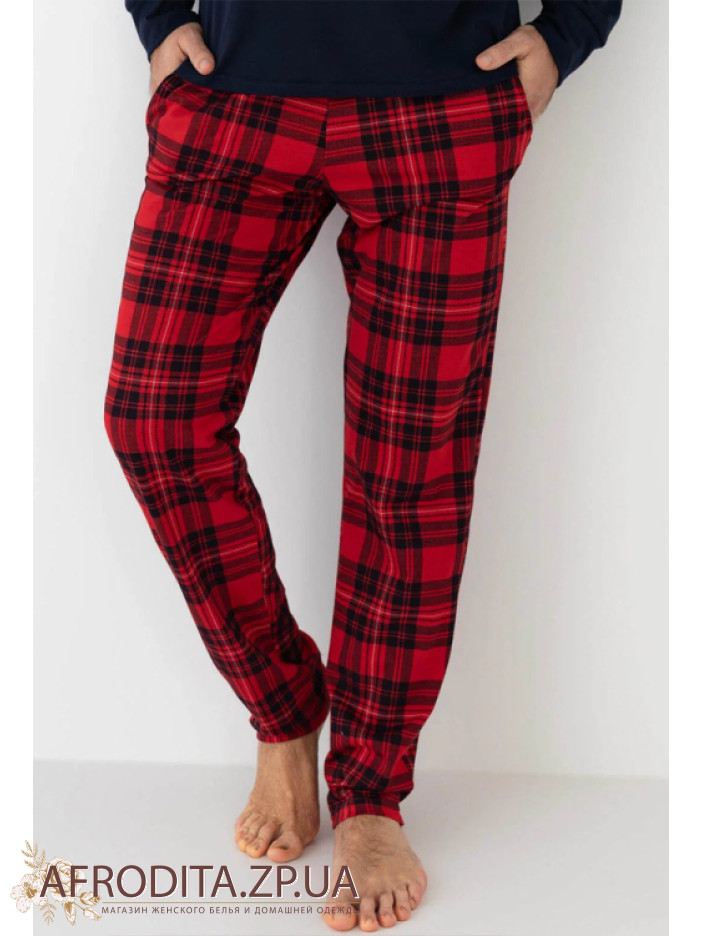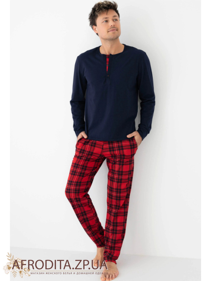 Чоловічі піжами зі штанами Sensis Xavier з бавовняної тканини. Комплект складається з джемпера темно-синього кольору з довгими рукавами та штанів прямого крою у шотландську клітку.