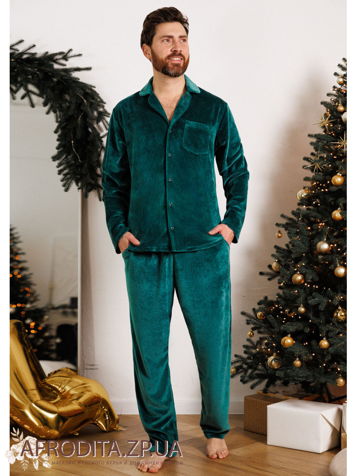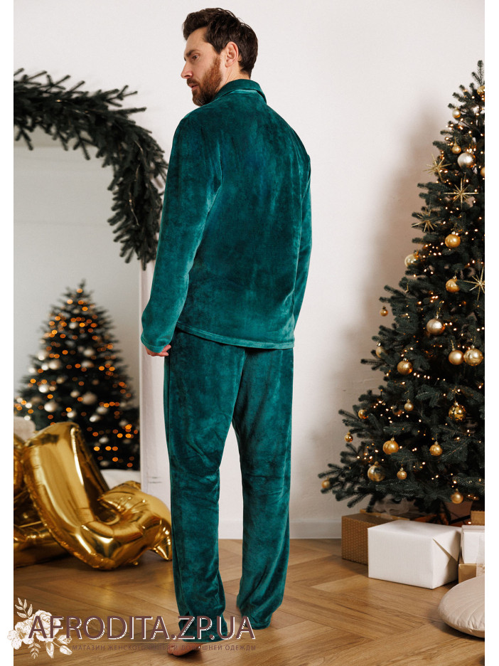 Чоловіча тепла піжама 1609-50007 зі штанами у кольорі смарагд виготовлена з модалу. У комплект входить сорочка з довгими рукавами та штани прямого крою з бічними кишенями.