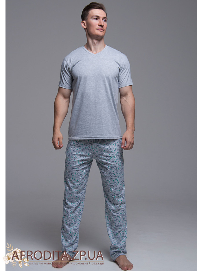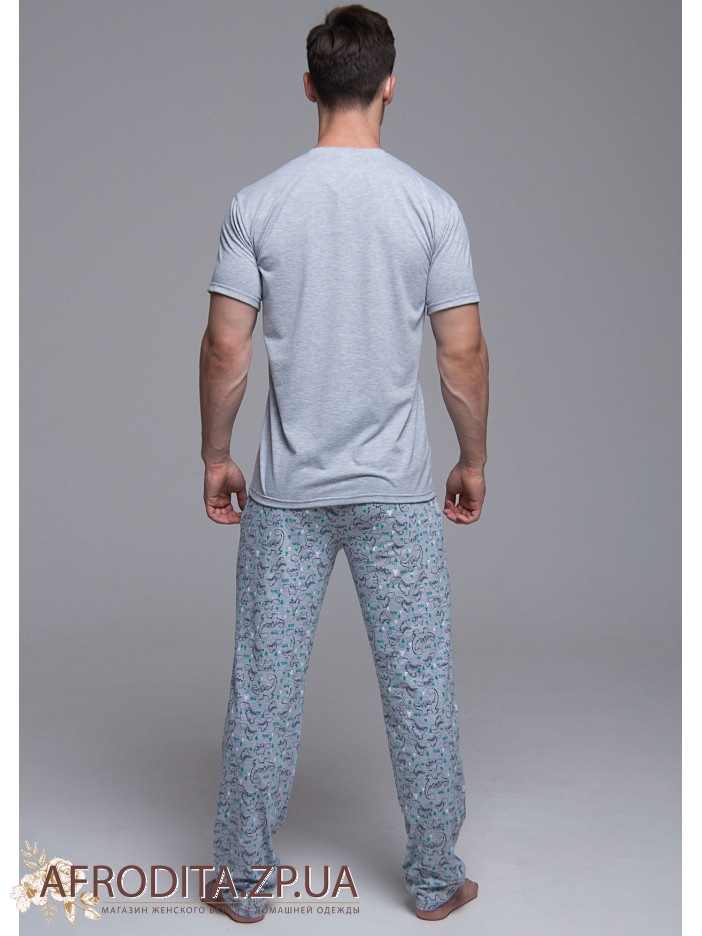 Чоловічий домашній комплект 653-16008 із бавовни, що складається з футболки сірого кольору з коротким рукавом та штанів прямого крою.