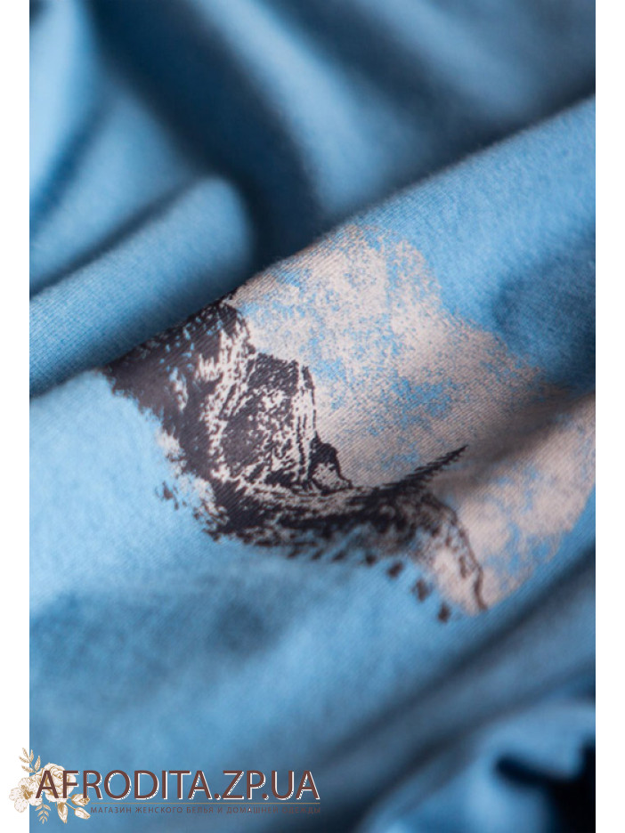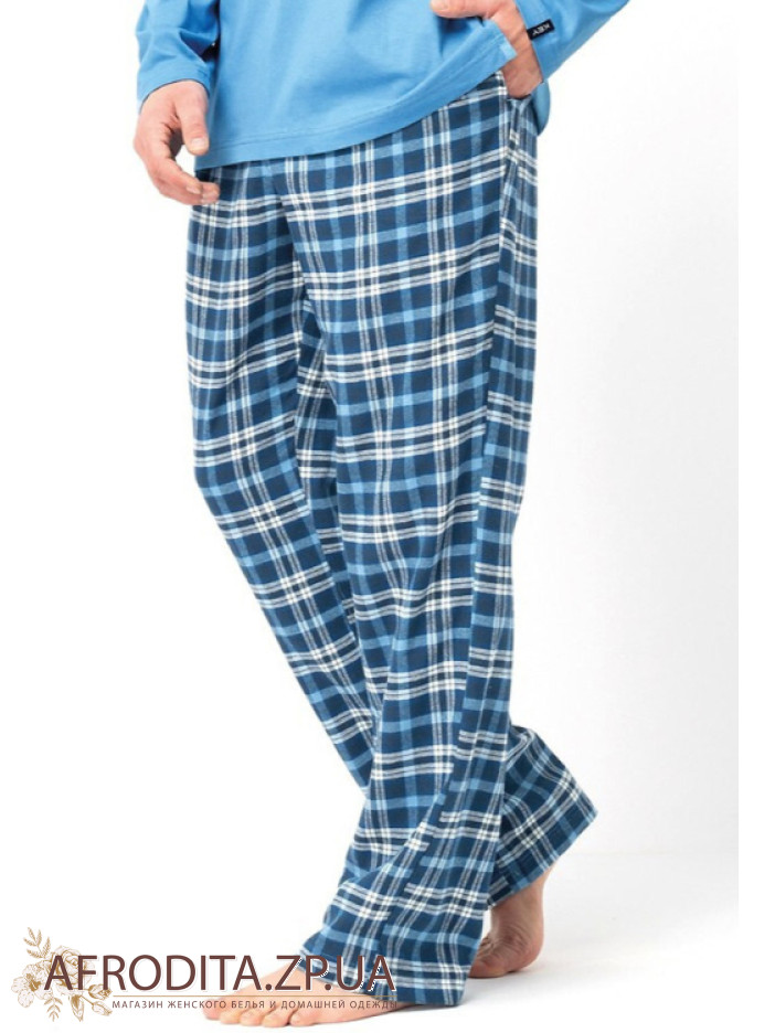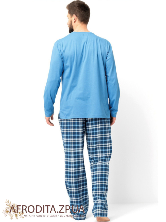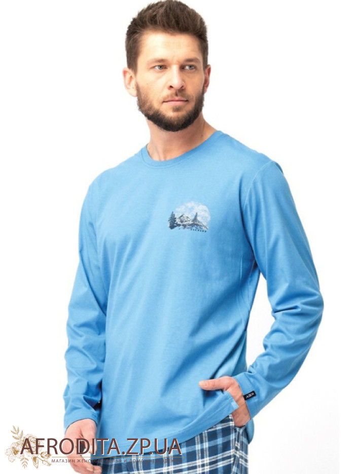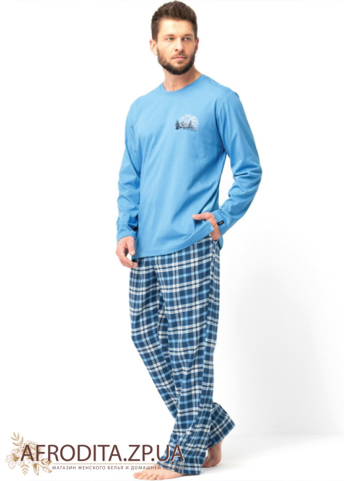 Чоловічий домашній комплект із бавовни Key 82633 виробництво Польща. Модель складається із джемпера блакитного кольору з довгими рукавами, зліва на грудях розташований принт у вигляді гір. Штани прямого крою з фланелі у клітку, у бічних швах розташовані кишені. Комплект відмінно підійде як подарунок близькій вам людині.