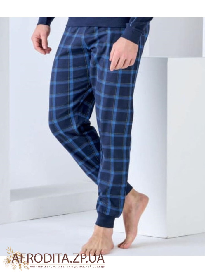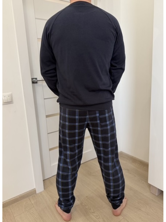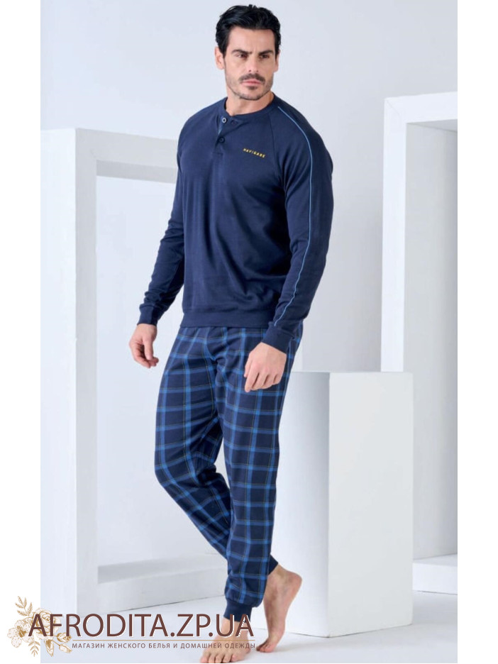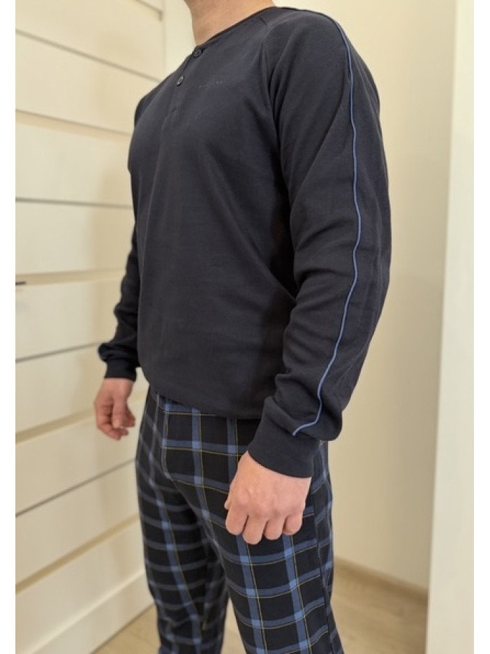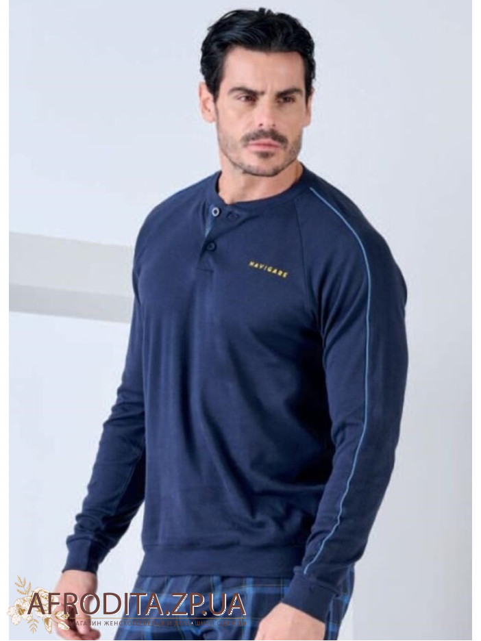 Чоловічий домашній комплект із бавовни Navigare 141945 від італійської торгової марки Navigare. Піжама складається з джемпера темно-синього кольору з довгими рукавами, обробленими манжтами, горловина застібається на гудзики. Від плеча до краю рукавів як декор розташований контрастний кант. Штани прямо крою на гумці в картатий принт.