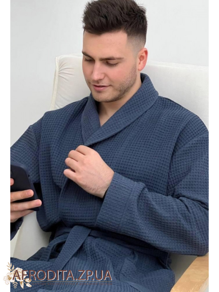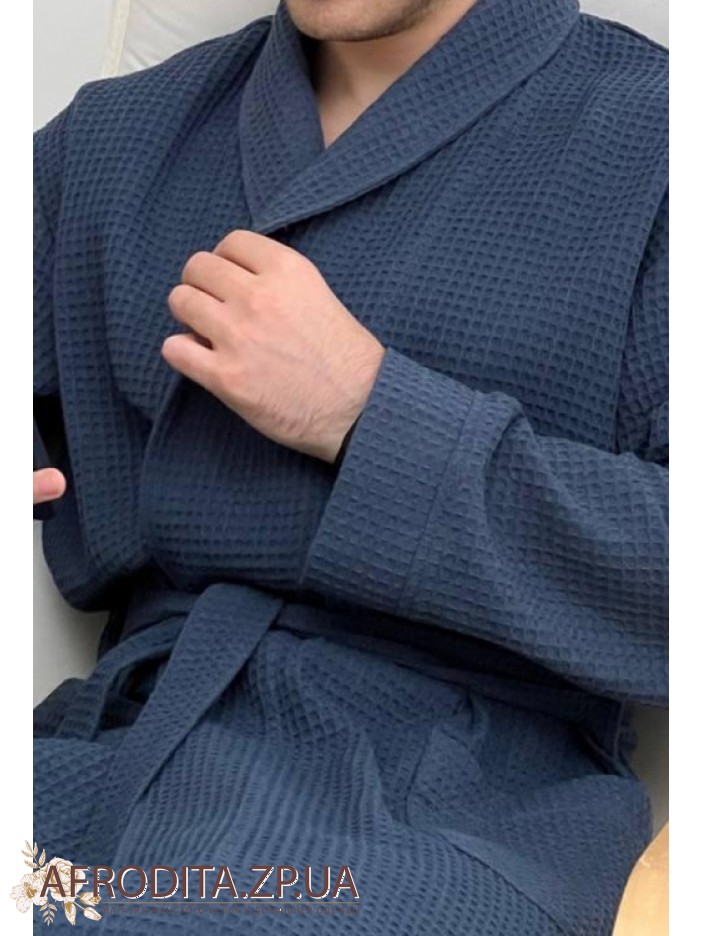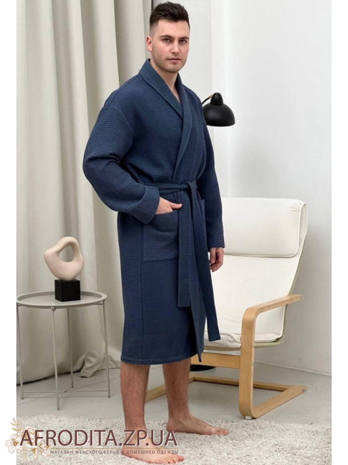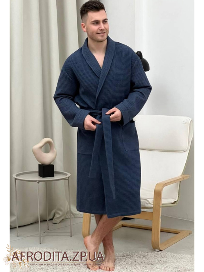 Чоловічий халат халат темно-синього кольору 920 від української торгової марки COSY виготовлений з якісної фактурної бавовни. Халат на запах довжиною нижче колін, спереду розташовані дві накладні кишені. У комплекті також додається пояс, за допомогою якого можна регулювати лінію талії. Ця модель відмінно підходить як для сауни, так і для домашнього вжитку. Халат виглядає дуже солідно і презентабельно і може бути хорошим подарунком для близької вам людині.