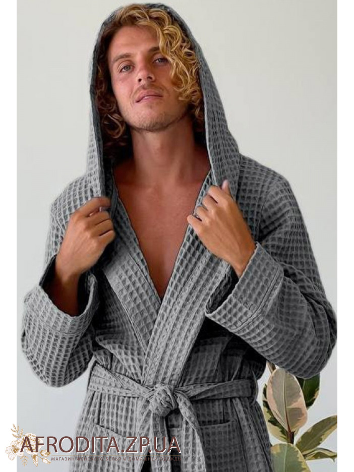 Чоловічий домашній вафельний халат 902 від української Cosy із фактурної бавовни. Халат з капюшоном на запах, довжиною нижче колін. З боків виробу розташовані дві накладні кишені. У комплекті додається пояс, за допомогою якого можна регулювати лінію талії. Халат виглядає дуже стильно і елегантно і може послужити чудовим подарунком близькій вам людині.
