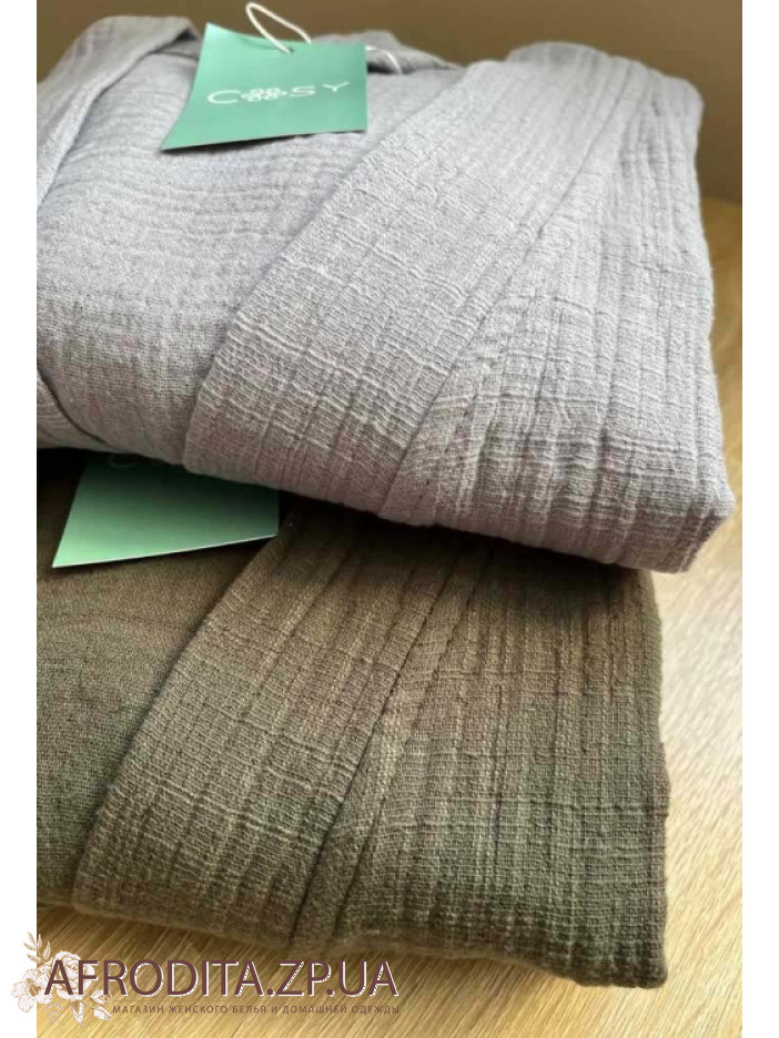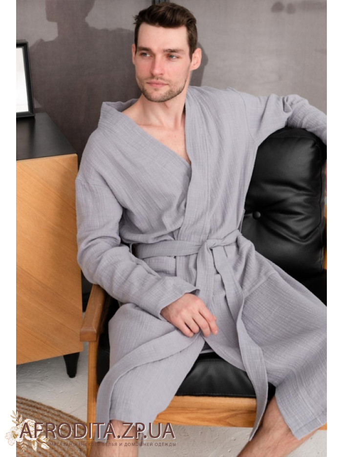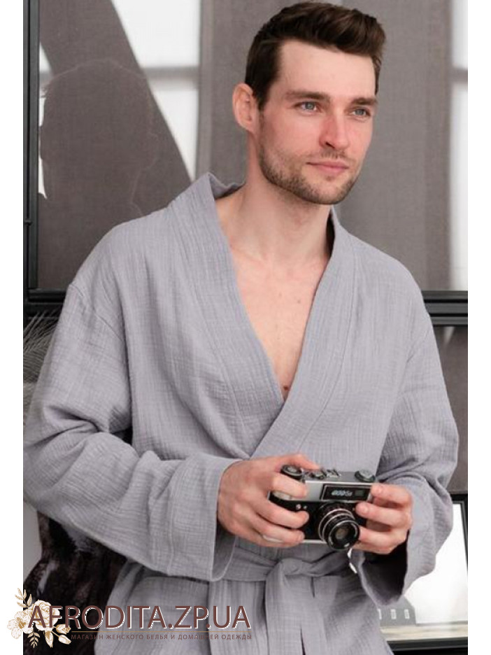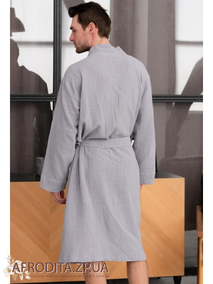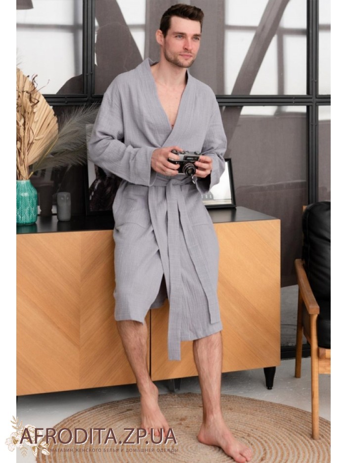 Чоловічий халат M60 від українського бренду Cosy виготовлений з фактурного мусліну на основі бавовни. Халат на запах довгою трохи нижче колін, рукав довгий. Модель має дві накладні кишені, в комплекті додається пояс за допомогою якого можна регулювати лінію талії. Виріб дуже м'який і приємний до тіла і може бути хорошим подарунком близькій людині.